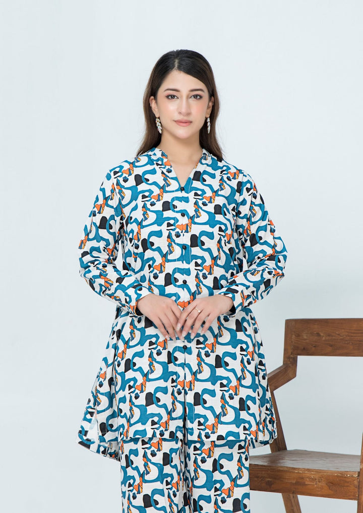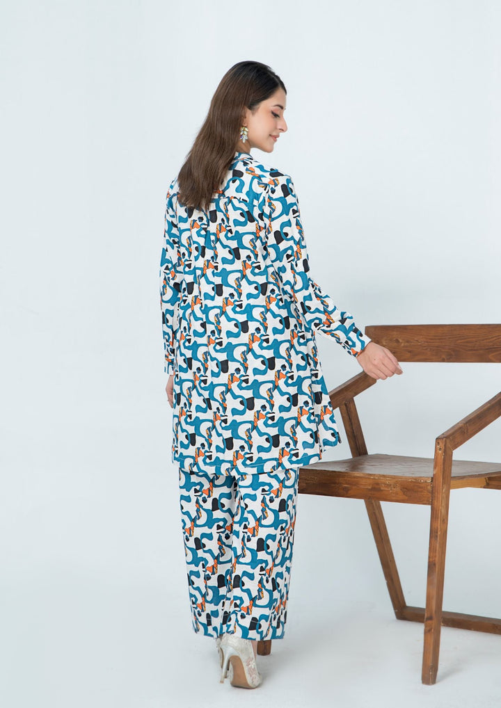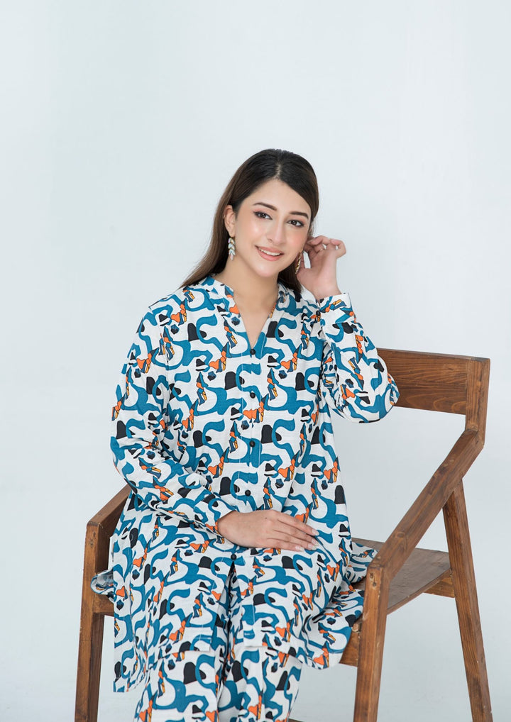 Make a bold fashion statement with this 2-Piece Khaddar Digital Print Suit. Featuring an artistic abstract pattern in teal blue, black, and orange on a crisp white base, this outfit is all about modern creativity and playful charm. Tailored from soft khaddar, it ensures both comfort and standout style during the winter season.