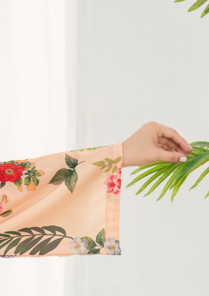 Experience elegance with this Arabic Silk 2-piece outfit, featuring a beautifully printed shirt adorned with vibrant floral and ethnic motifs. Perfect for semi-formal gatherings and casual evenings, the breathable Arabic Silk fabric ensures comfort while keeping your style effortlessly graceful.