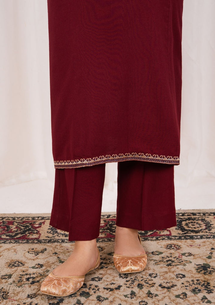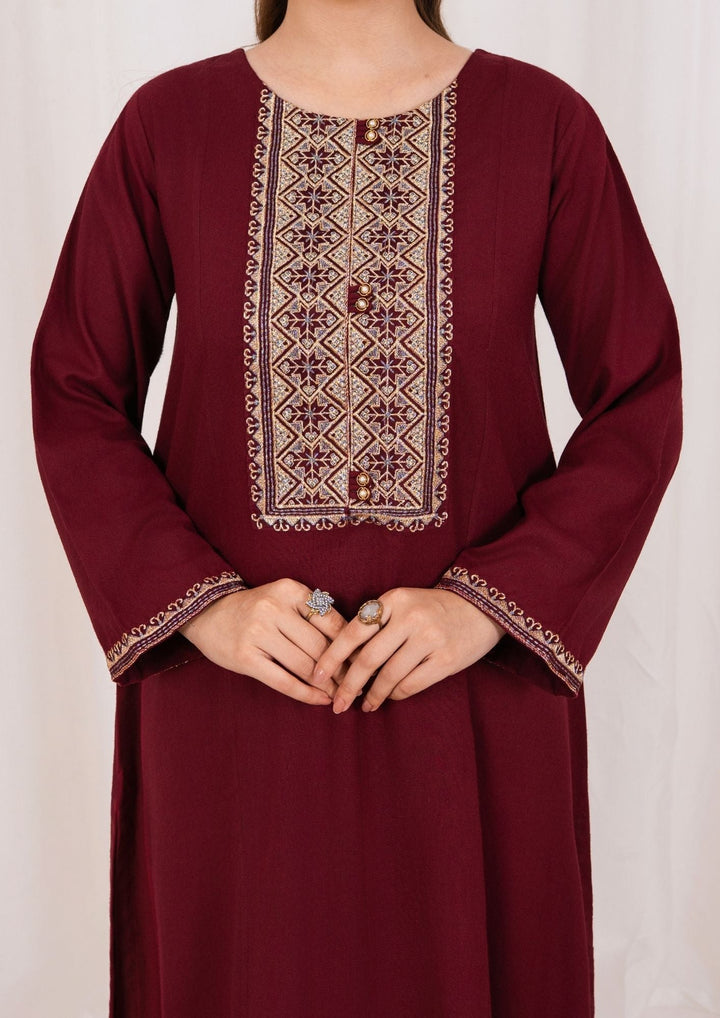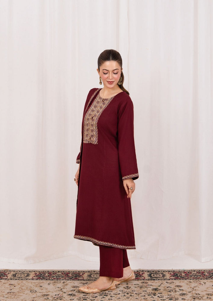 Add a touch of sophistication to your winter wardrobe with this 3-piece Embroidered Alpine outfit, designed for both style and comfort. The 45-inch long shirt features intricate geometric embroidery on the neckline and borders, giving it a modern yet traditional flair. Paired with a straight trouser for a sleek silhouette, the look is completed with an embroidered border shawl, making it a versatile choice for seasonal gatherings.