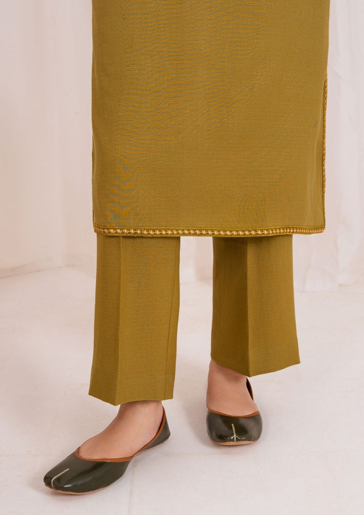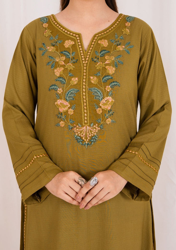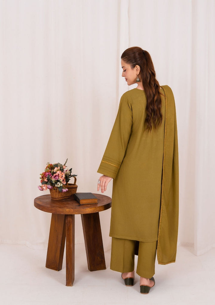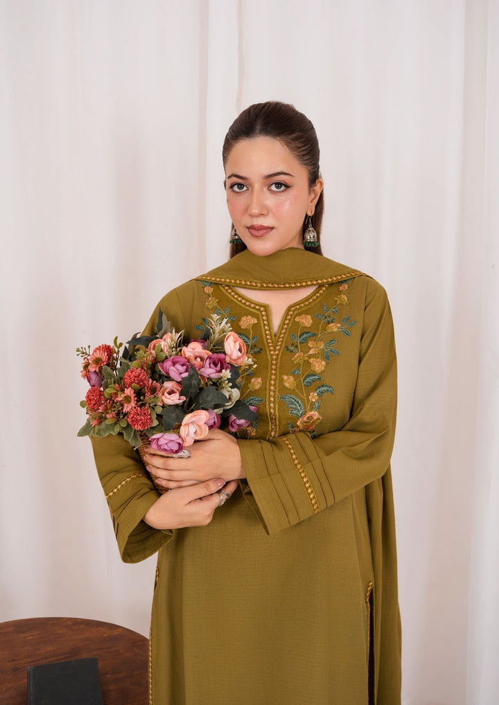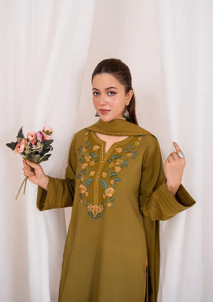 Bring elegance and comfort together with this 3-piece Embroidered Rib Karandi outfit, designed to elevate your winter wardrobe. The 45-inch long shirt features delicate multi-colored embroidery on the neckline and sleeves, adding a graceful charm to the earthy olive base. Paired with a matching trouser for a sleek silhouette, the look is beautifully finished with an embroidered border shawl for a refined touch.