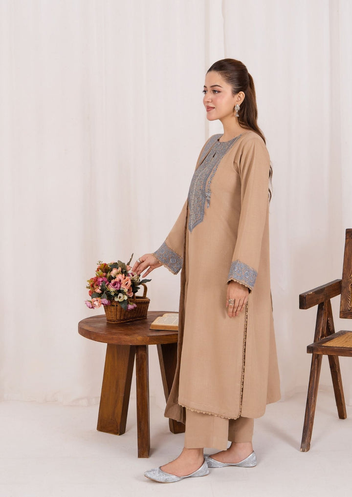 Exude understated elegance with this 3-piece Embroidered Silk Karandi ensemble, designed for timeless winter style. The 45-inch long shirt features intricate embroidery on the neckline and sleeves in soothing blue tones, perfectly complementing the soft beige base. Paired with a straight trouser for a graceful silhouette, the outfit is elevated with an embroidered border shawl, adding a refined and luxurious finish.