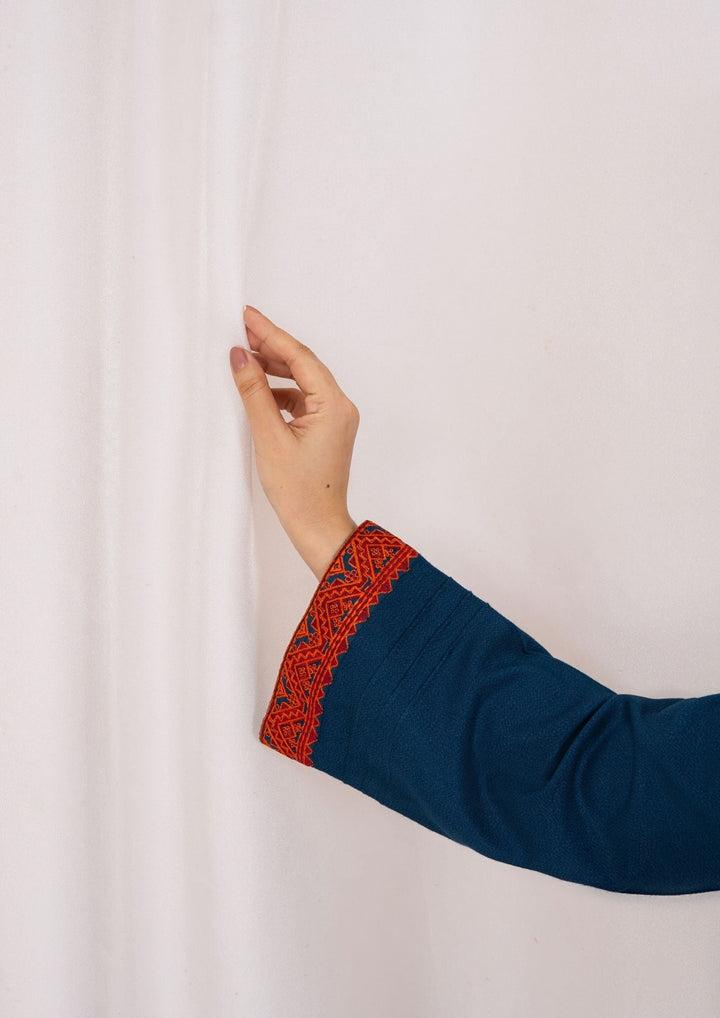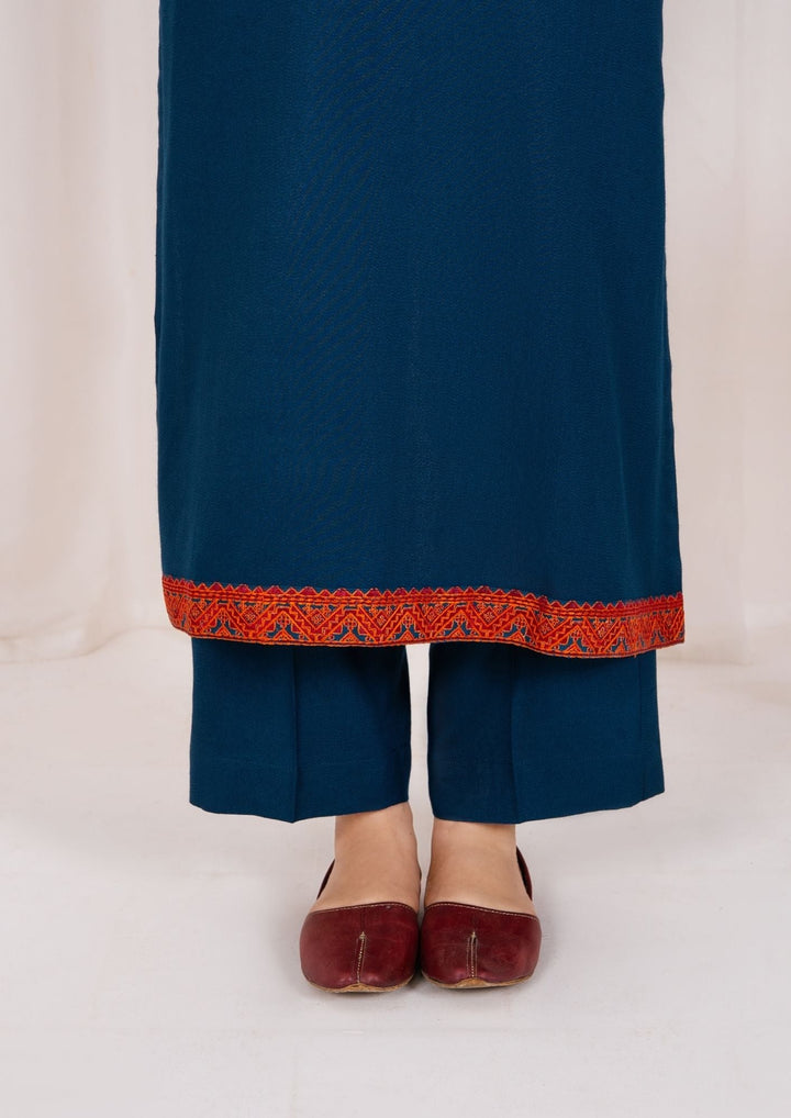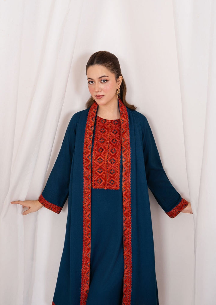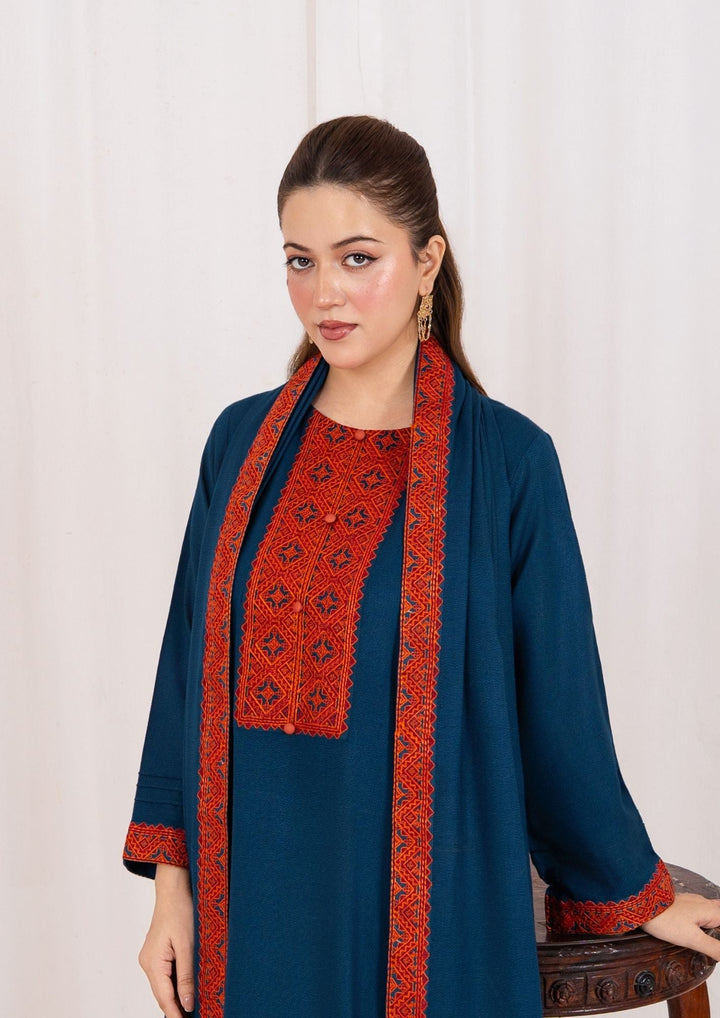 Turn heads this season with this 3-piece Embroidered Alpine outfit, a perfect blend of elegance and comfort. The 45-inch long shirt is adorned with rich red embroidery on the neckline and sleeves, creating a bold contrast against the deep navy base. Paired with a classic straight trouser, the ensemble is elevated with an embroidered border shawl, completing the look with a touch of refinement.