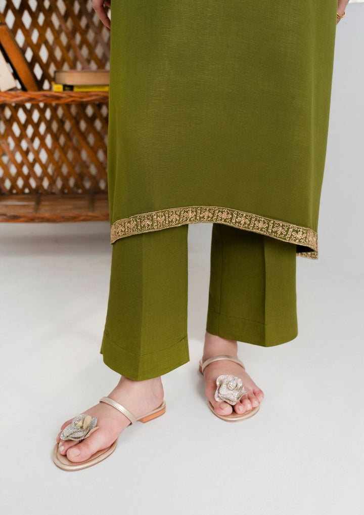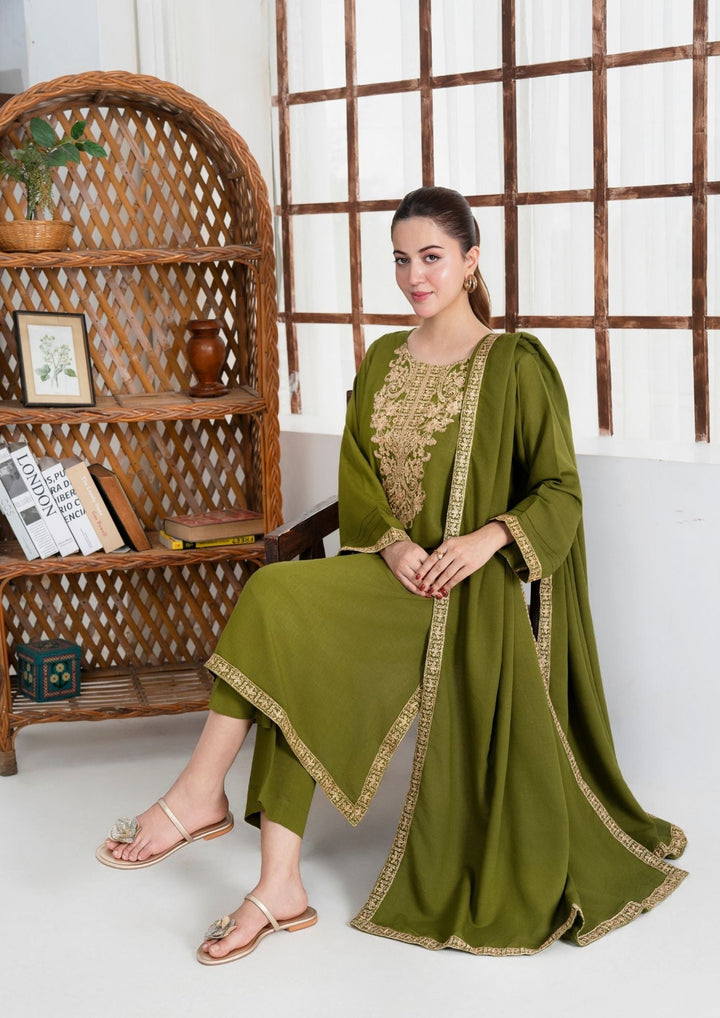 3 Pc Outfit - Karandi Embroidered Shirt and Plain Trouser with Silk Karandi Embroidered Border Shawl