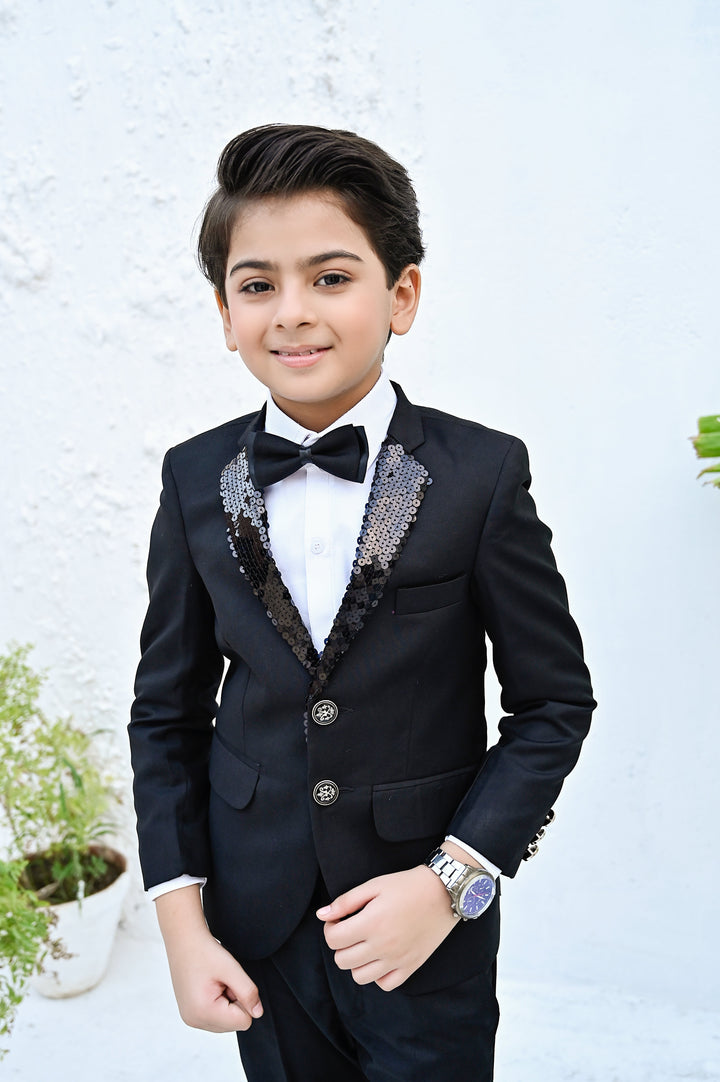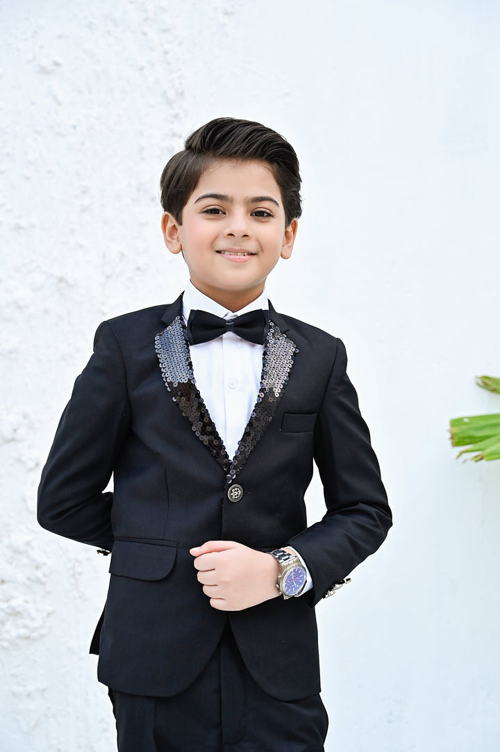The suit is a classic shade of black, accentuating your style with atouch of sophistication. The bow tie adds a charming and elegent flair to the outfit along with the sequin detailing. It’s the perfect ensemble for any formal occasion.