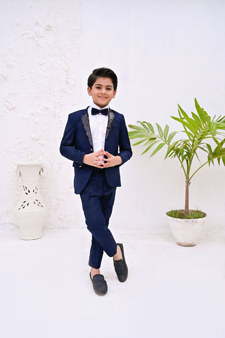 The coat pant is made from rich blue fabric and features intricate sequin work that adds a touch of sparkle and elegance. The bow tie adds a classy and sophisticated touch to the ensemble.This coat pant is sure to make a statement at any formal event.