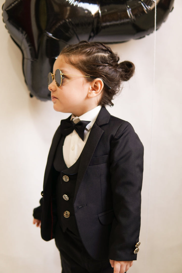 The suit features a sleek black coat with a tailored fit, giving you a polished and sophisticated look. The pants are perfectly matched, providing a clean and streamlined silhouette. The waistcoat adds an extra touch of style, with its matching black fabric and button detailing. The bow completes the ensemble, adding a touch of elegance and charm.Its a classic and timeless outfit that exudes confidence and class.