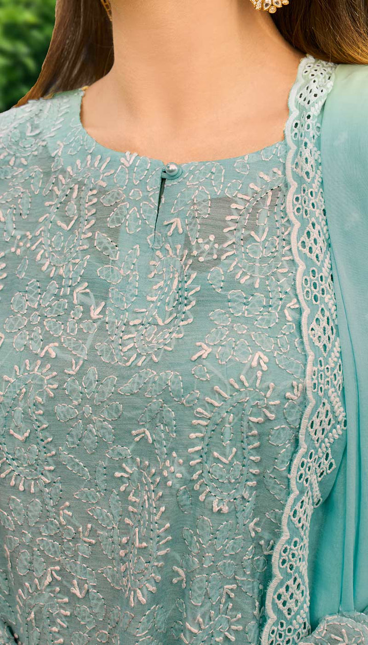 Please note that the Indian chikankari design may differ from the image due to its unique handcrafted nature, where each design is one-of-a-kind and can't be mass-produced. Hence showcasing the beauty of this old-age Indian craft. However, the outfit's stitching details and color will match the image.