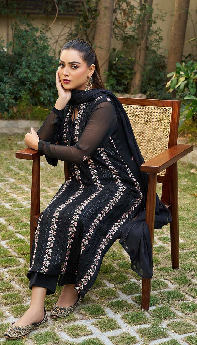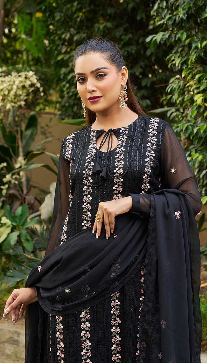 Enjoy the delicate charm of this delicate black chiffon outfit, Beautiful vertical stripes of flower embroidery in delicate pink and cream tones lift this black chiffon dress, adding a graceful touch to the traditional black foundation.