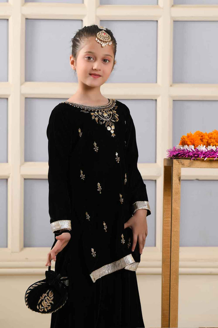 Fairy Queen’s Afrozeh, a black velvet formal Pakistani dress, is a masterpiece in children’s fashion. Crafted from the most exquisite velvet fabric, it sets a new standard for luxury. Adorned with gota, dapka, nakshi, resham, tilla and stone work, it’s not just a dress; it’s a promise of unparalleled quality and style for your child’s special moments
