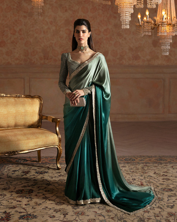 Harnessing high glam, Ailey exudes effortless sophistication. Crafted on an opulent ombré green canvas, the silk saree is adorned with a myriad of cut dana, stones and sequins highlighting its statement silhouette. This set includes a delicately adorned velvet blouse that further elevates the timeless appeal of the outfit, ensuring you stand out wherever you go.