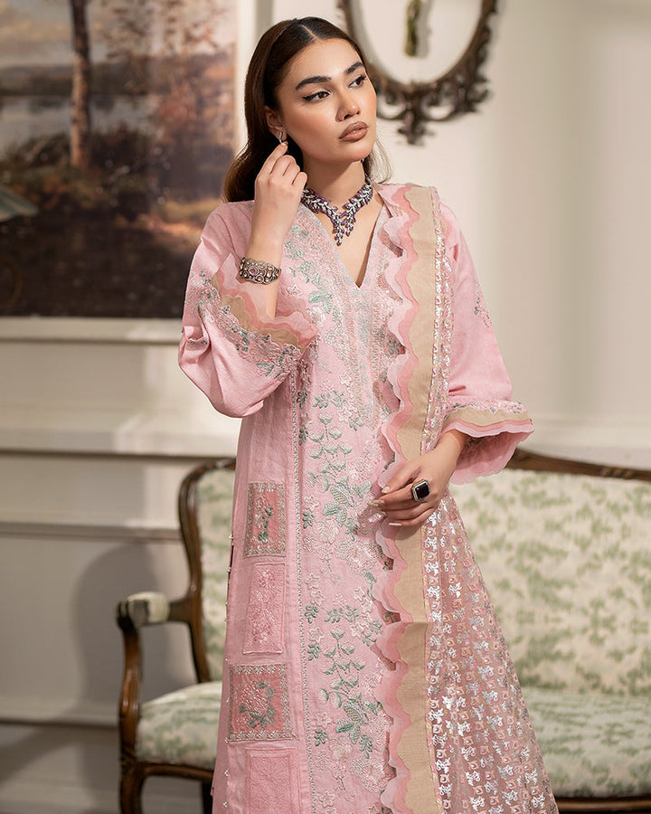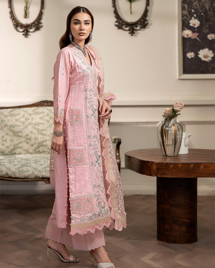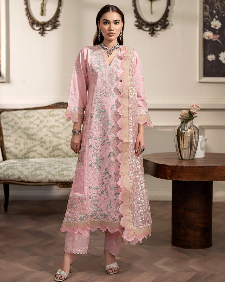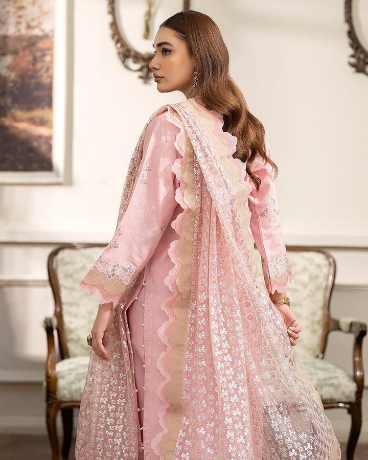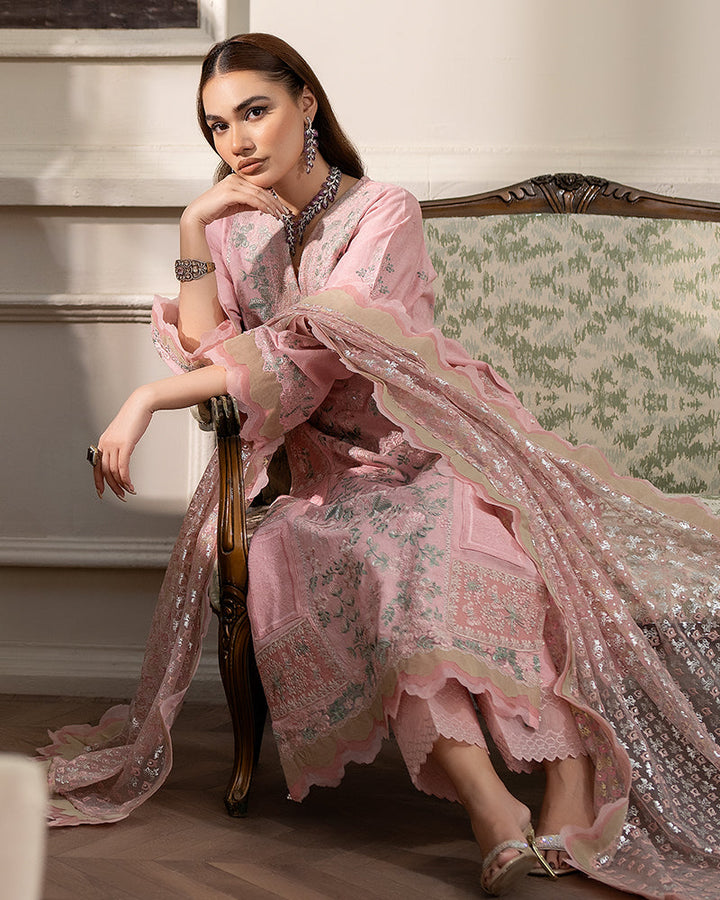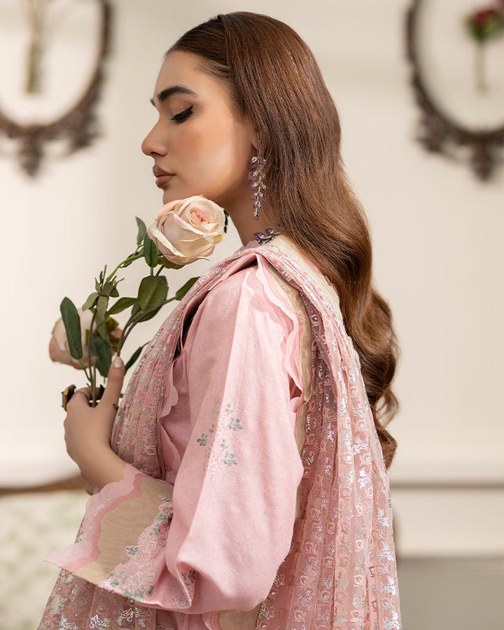 Net dupatta is a work of art in itself composed with screen printing and scalloped borders.