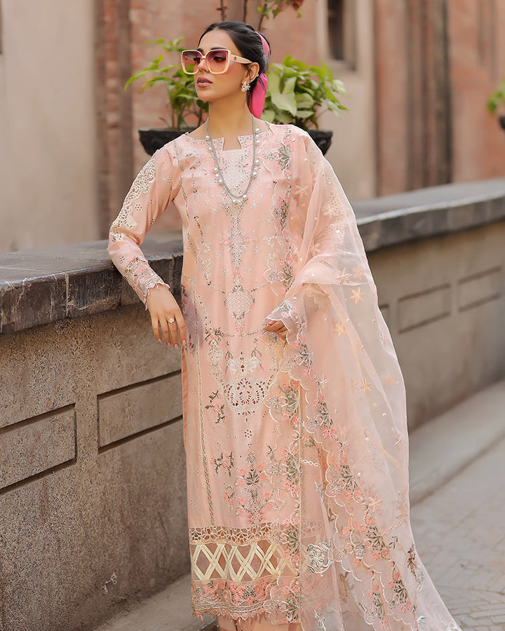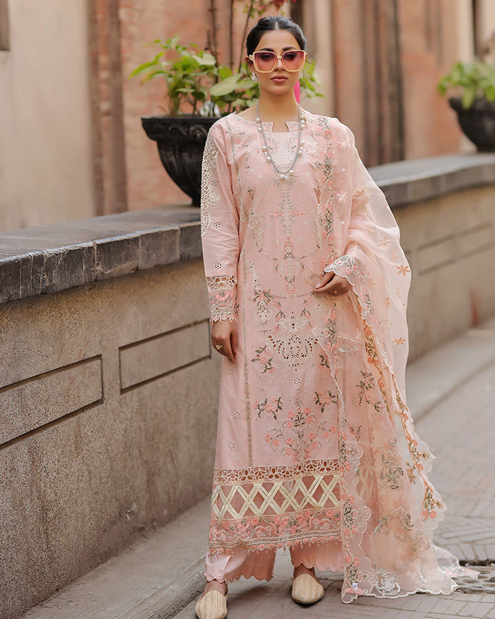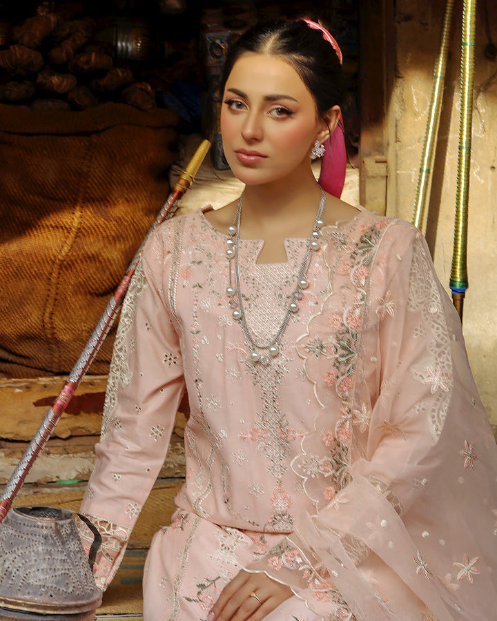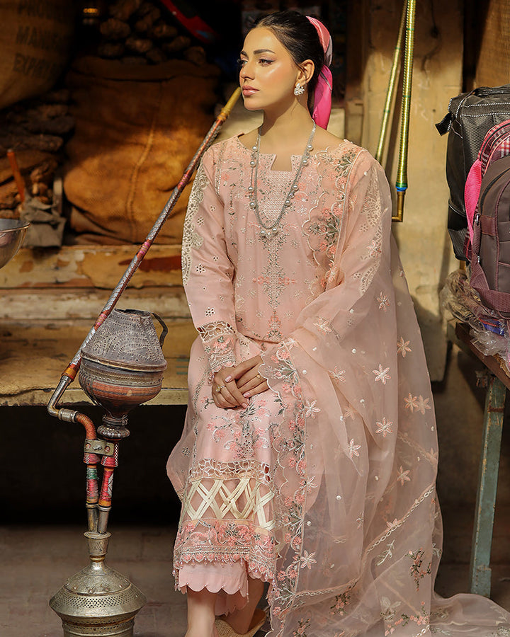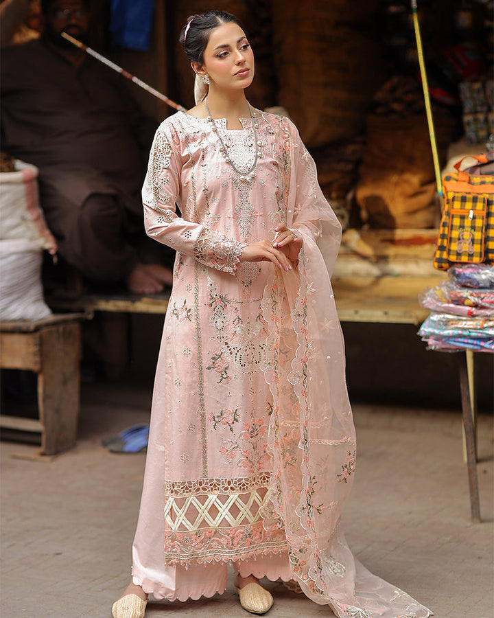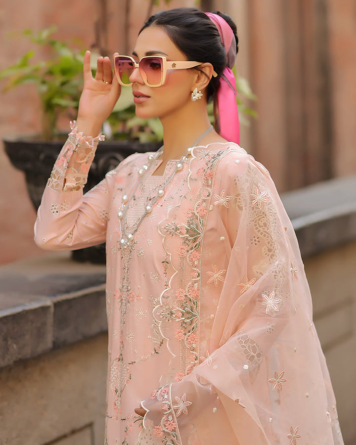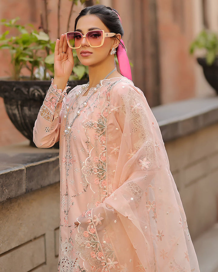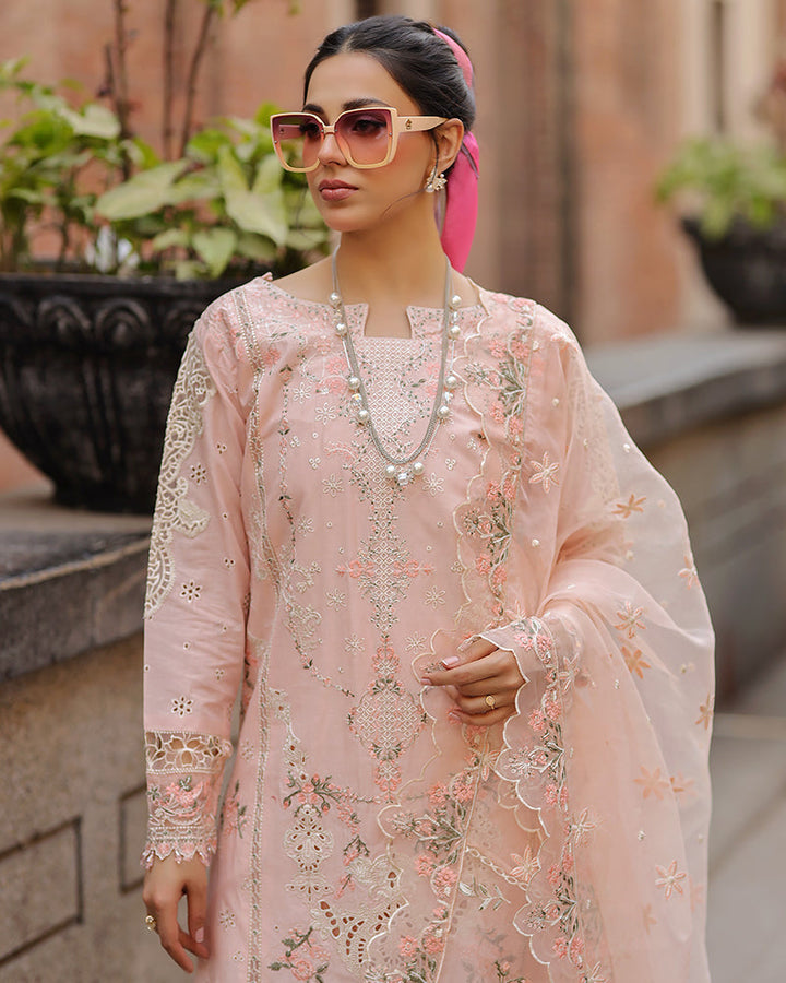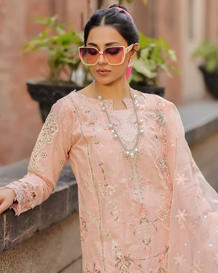 Stunning cotton chikankari shirt! It is expertly crafted with intricate embroidery, organza patches, and eye-catching crystal tassels Organza dupatta features beautiful multi-thread and scalloped borders Cotton palazzo pants are adorned with elegant pearls embellishments. |