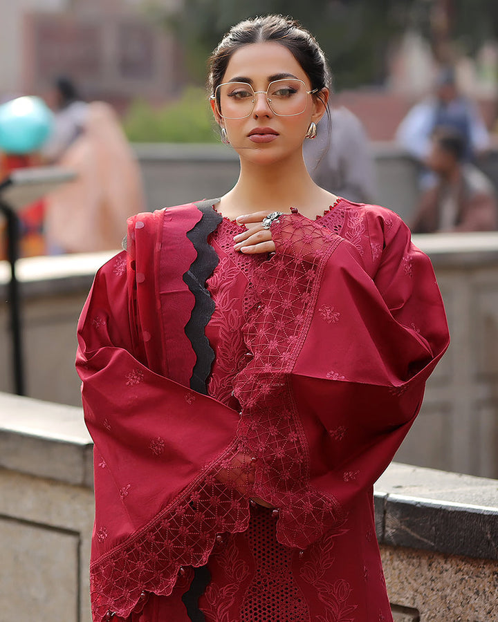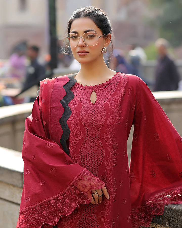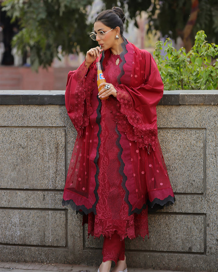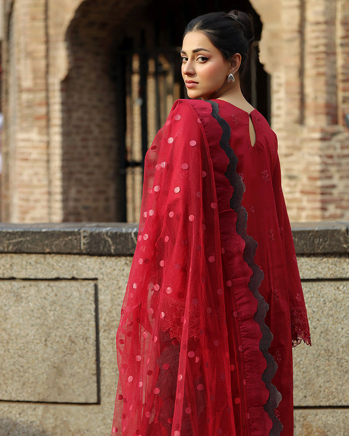 Cotton chikankari shirt features intricate embroidery and delicate hanging pearls Net dupatta is adorned with a beautiful screen print and scalloped borders Cotton embroidered trousers featuring scalloped detailing |