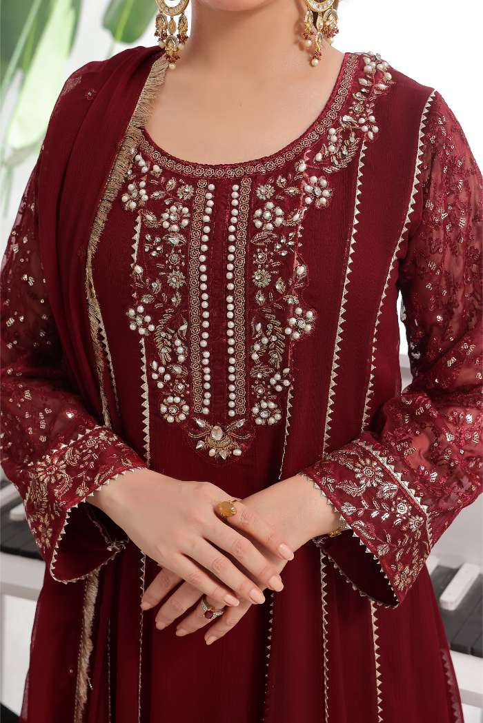 This elegant long chiffon frock is designed for a graceful and sophisticated look. Made from lightweight embroidered chiffon, it offers a flowy and ethereal feel. The neckline is adorned with intricate zardozi and pearl work, adding a touch of luxury and elegance. The panels of the frock feature delicate samosa lace, enhancing the overall structure with a refined finish. The inner layer is made of duplicate chiffon, ensuring comfort while maintaining the sheer beauty of the fabric. Paired with a crape trouser, this outfit balances tradition and modernity, making it perfect for formal gatherings, weddings, and festive occasions.