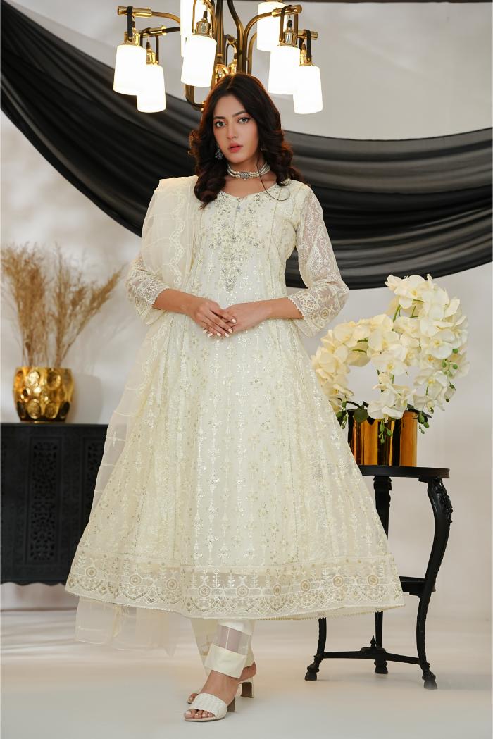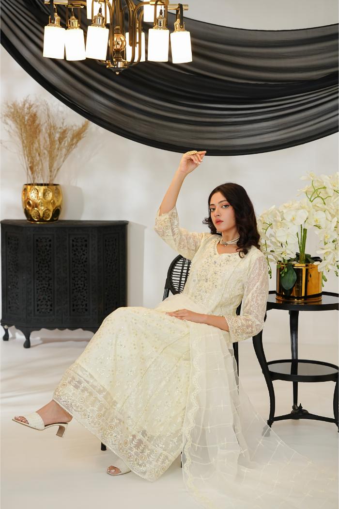This outfit is beautifully crafted on Khaadi Javeria Net fabric, featuring exquisite 3MM sequin thread work and delicate self-embroidery, adding a graceful charm and timeless elegance to the design.