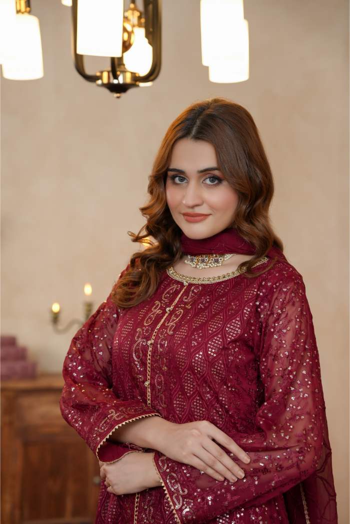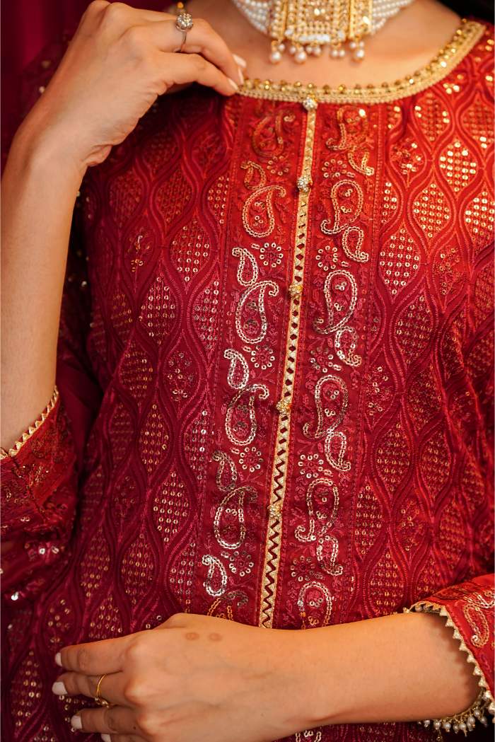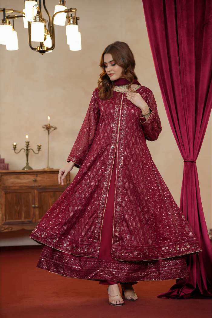 This stunning ensemble is crafted on premium chiffon fabric, beautifully adorned with intricate chikan kari embroidery and delicate thread work that adds timeless charm. The neckline is accentuated with exquisite hand embellishments, lending a regal touch to the design. Featuring a graceful front-open double shirt style, this outfit combines elegance with a contemporary silhouette. The rich maroon hue paired with its detailed embroidery makes it an ideal choice for festive occasions, weddings, and formal gatherings.