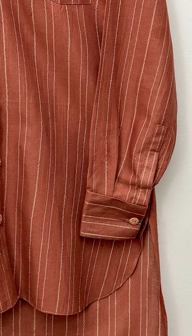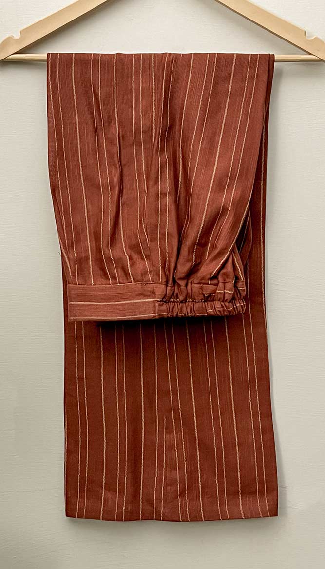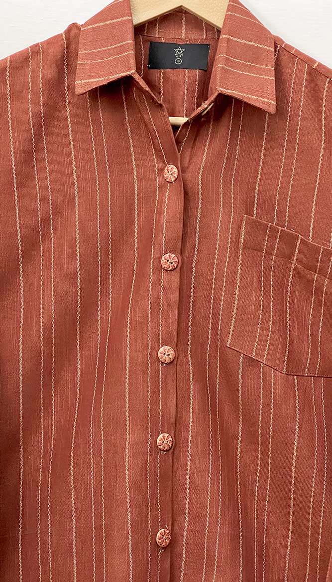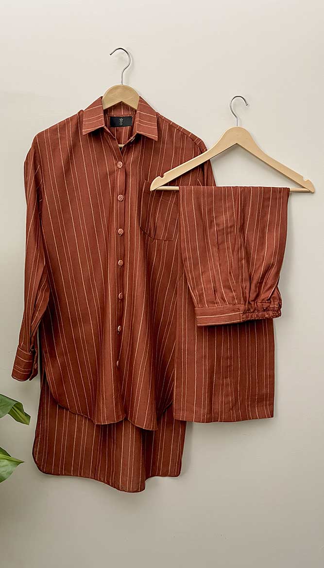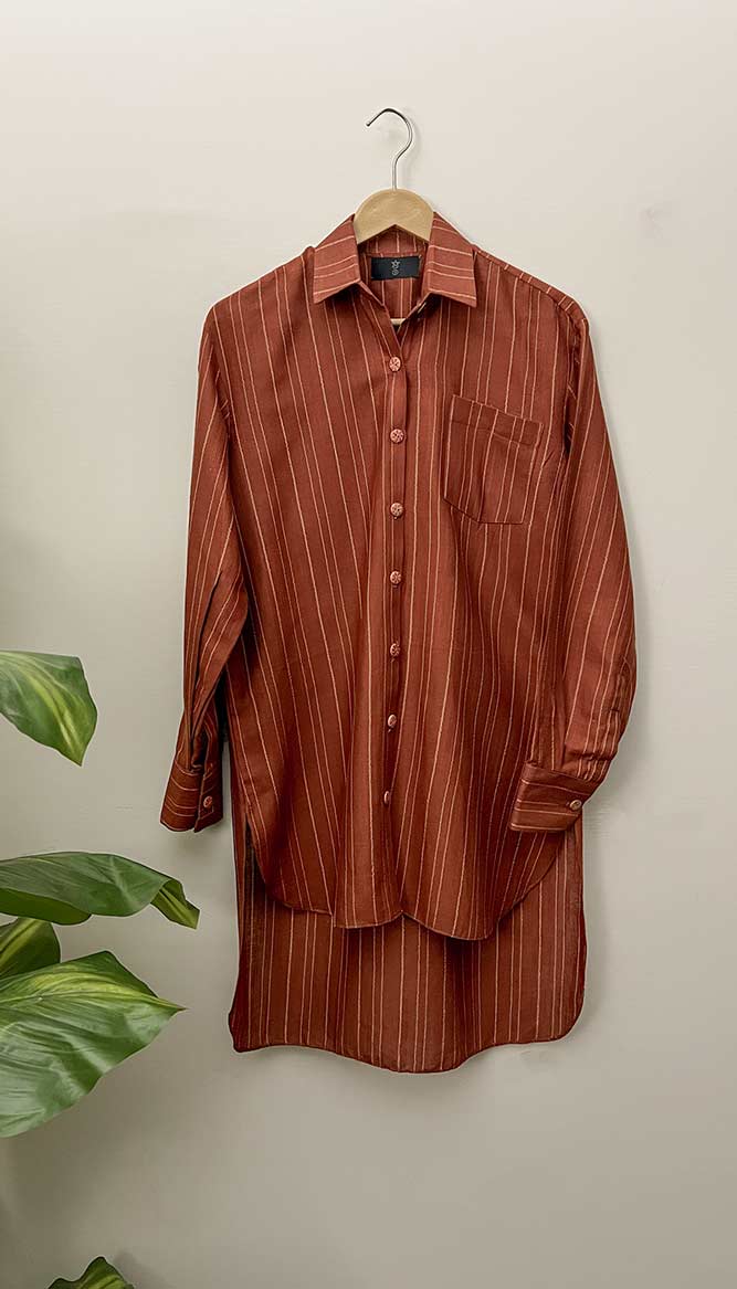 The deep, earthy tone of this rust-colored shirt and its elegant striped design make it stand out. The sweater looks sleek and elongated. The vertical stripes are ideal for a put-together yet relaxed approach. The shirt is perfect for work and casual settings because of its breathable Karandi fabric, which guarantees comfort throughout the day.