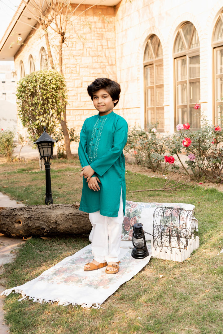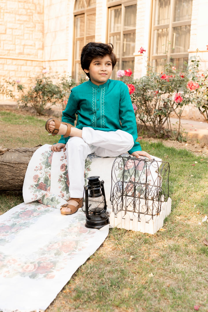 Al Qaswa - Boys Sea Green Embroidered Kurta – Ban Collar Outfit for Eid 2025