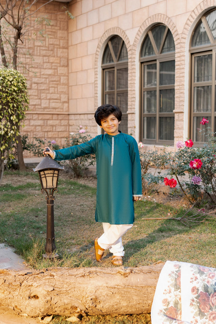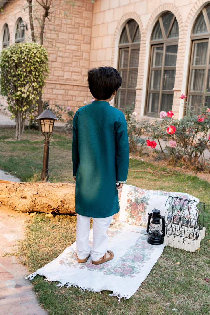 Al Qaswa - Boys Sea Green Embroidered Kurta – Ban Collar Outfit for Eid 2025