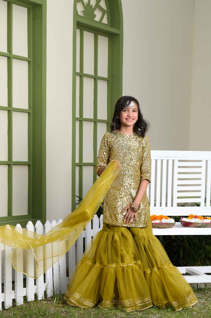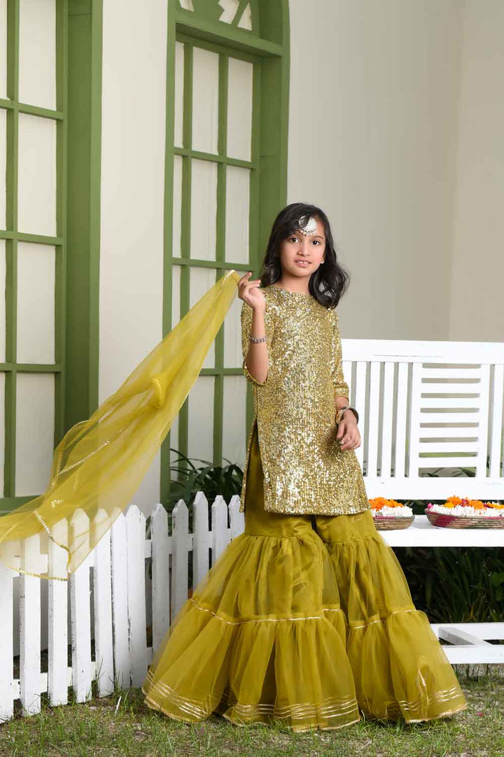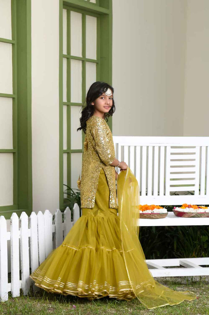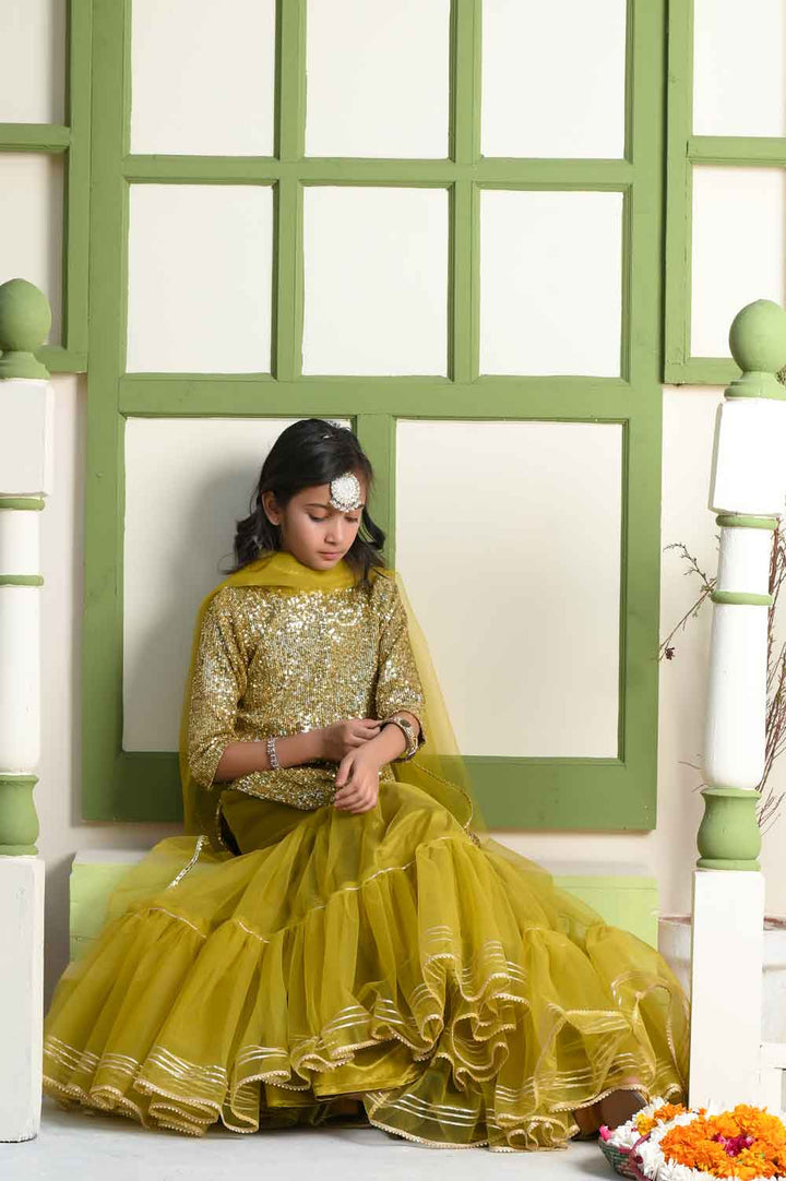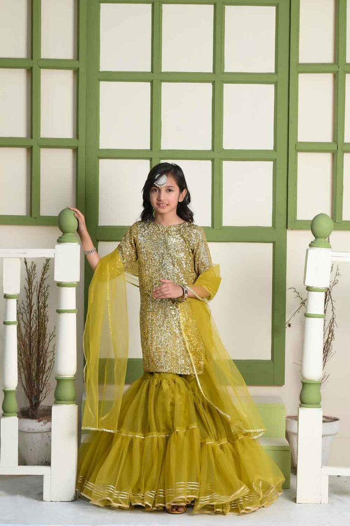 Introducing "Chambeli" by “Fairy Queen by Ayesha Hamza”, a delightful ensemble in a vibrant shade of green. This charming dress includes a Choli, Dupatta, and Lehnga, each thoughtfully designed. The Chambeli outfit is perfect for adding a touch of grace to any occasion. Dress your child in this lovely attire, where the lively green color and stylish design come together to create a look that's both elegant and festive.