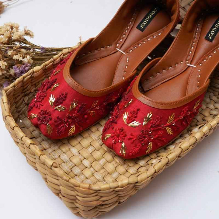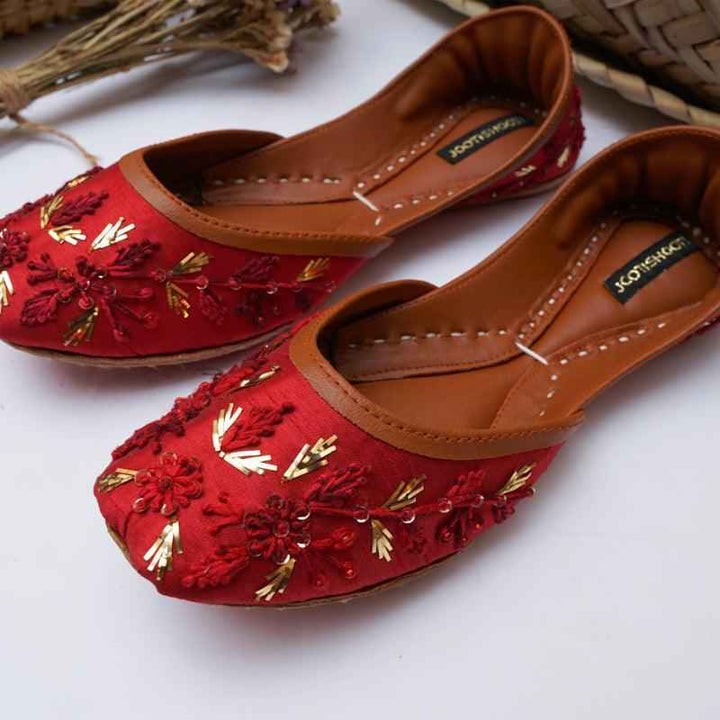 Introducing Chameli Red- This red silk khussa is embellished with detailed gold mukesh metal thread, gold sequins, and beads, all meticulously crafted with affection and attention to detail. The shades of red and gold adds an exquisite touch to this khussa. Its artistic allure renders it a distinctive and enchanting addition to your wardrobe.