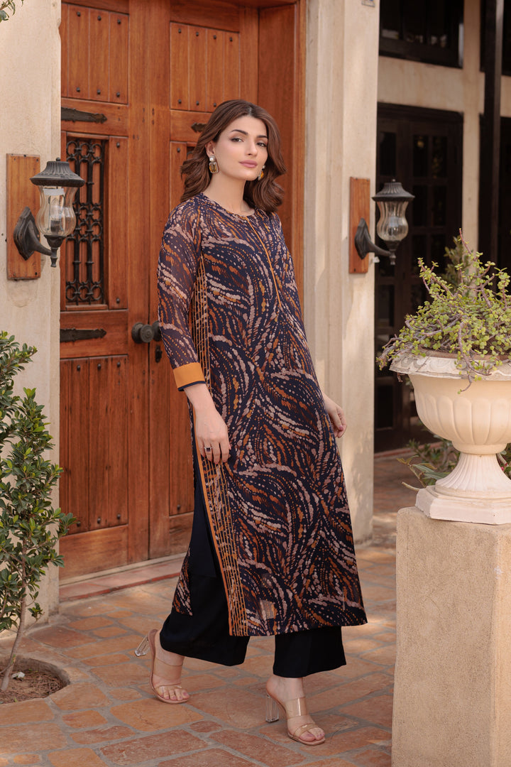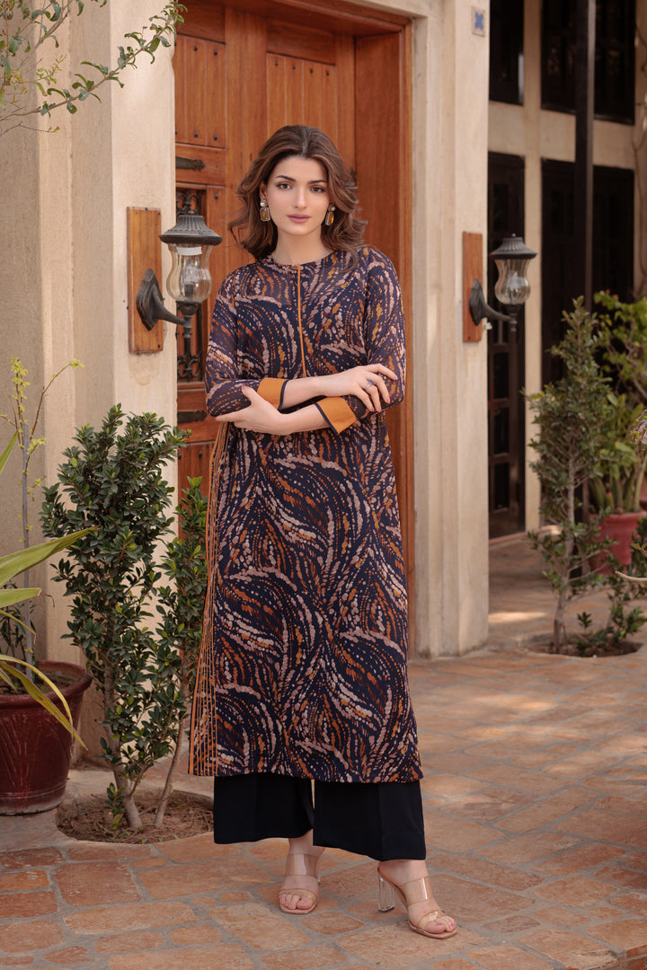 A captivating fusion of midnight blue and mustard, this effortlessly chic long shirt is crafted from luxurious crepe. Designed for both comfort and elegance, it features delicate pintuck detailing and intricate embroidery along the sides, adding depth and sophistication to its relaxed silhouette.