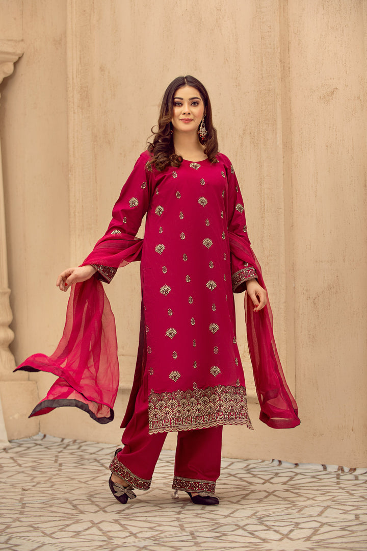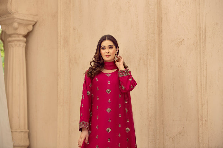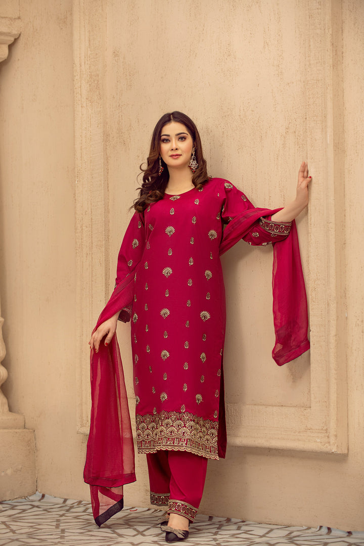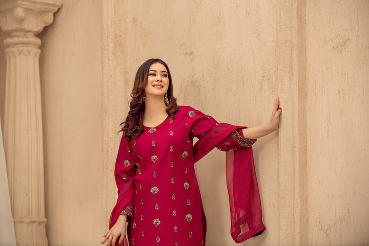 A timeless expression of tradition, the Afsaneh Embroidered Suit features exquisite embroidery on a gracefully tailored shirt, paired with a classic trouser and an elegant dupatta. Perfect for festive gatherings and cultural celebrations, this ensemble embodies heritage with a touch of sophistication.