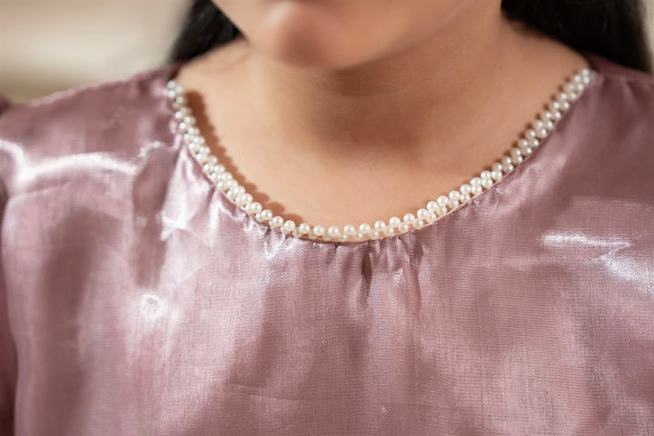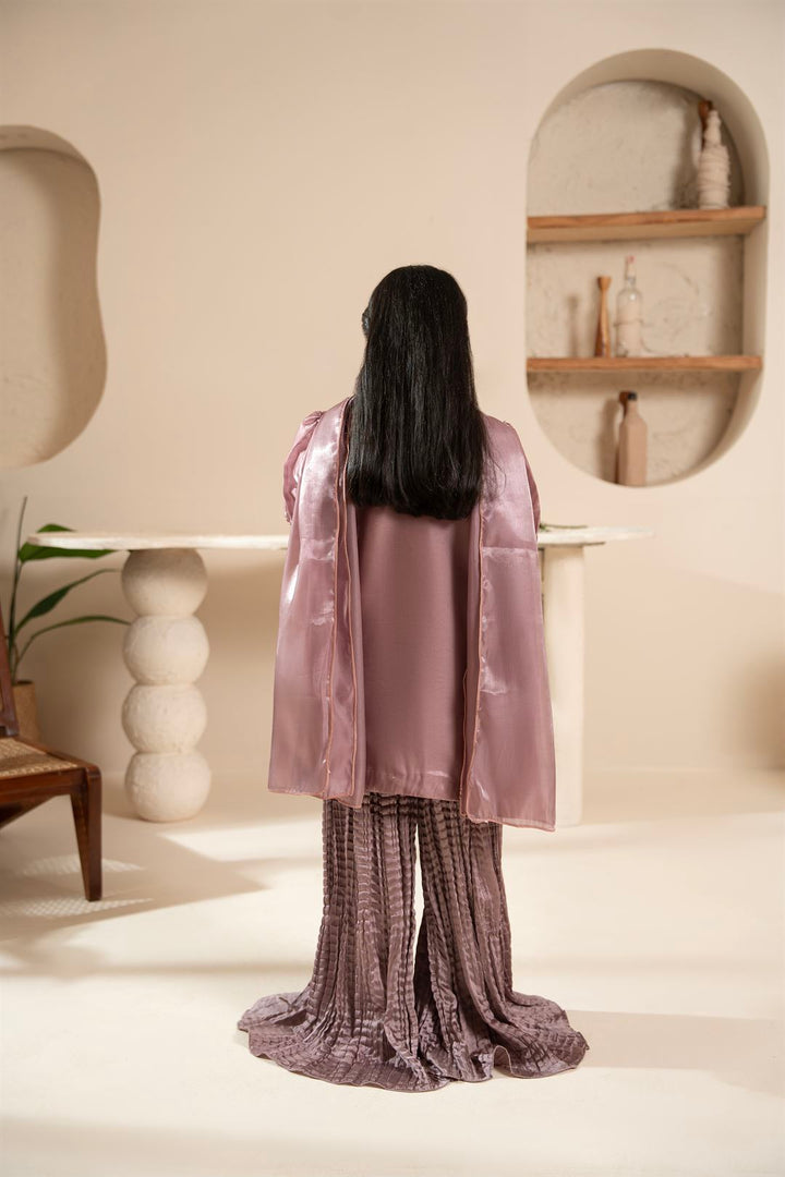 A graceful 3-piece outfit featuring a teapink shesha silk shirt adorned with sequin and stone work, paired with a crush silk sharara and a delicate dupatta – perfect for weddings and festive occasions.