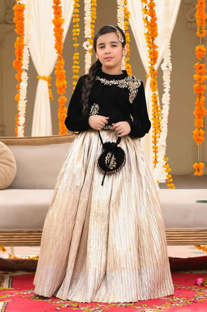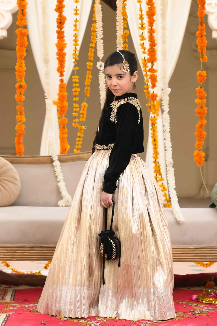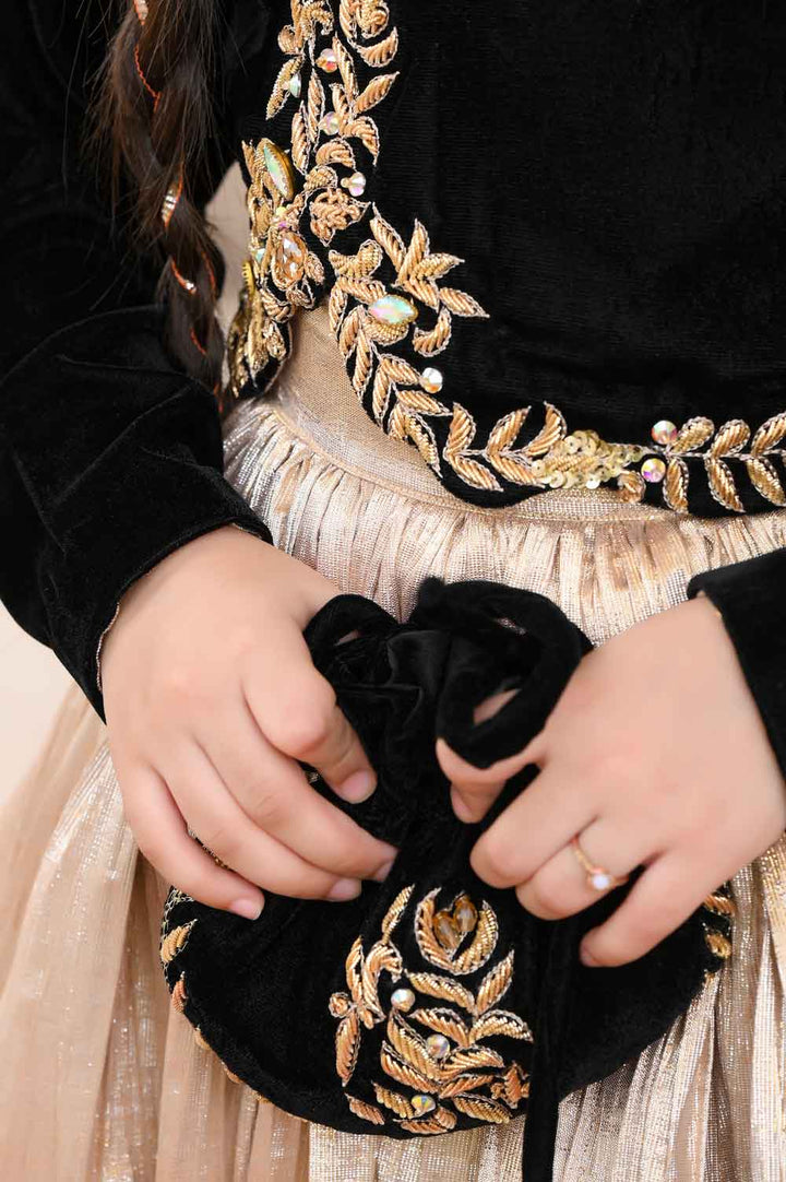 Introducing "Diya" by “Fairy Queen by Ayesha Hamza”, an enchanting ensemble in the timeless combination of black and golden. This exquisite dress features meticulous Cora, dazzling Dapka, captivating Stone, and regal Tilla work, adorned with charming Beats for added elegance. The Lehnga boasts a lavish 4-yard flare, crafted from Indian crush tissue fabric, ensuring a luxurious and graceful drape. "Diya" is more than a dress; it's a fusion of sophistication and style, designed to make a statement at any special occasion. Step into the spotlight with this extraordinary piece that combines tradition and modern flair seamlessly.