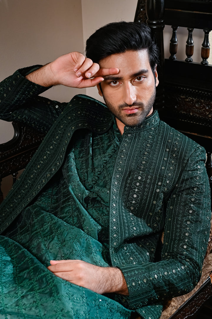 Emerald Green Embroidered Front Open Princecoat For Wedding