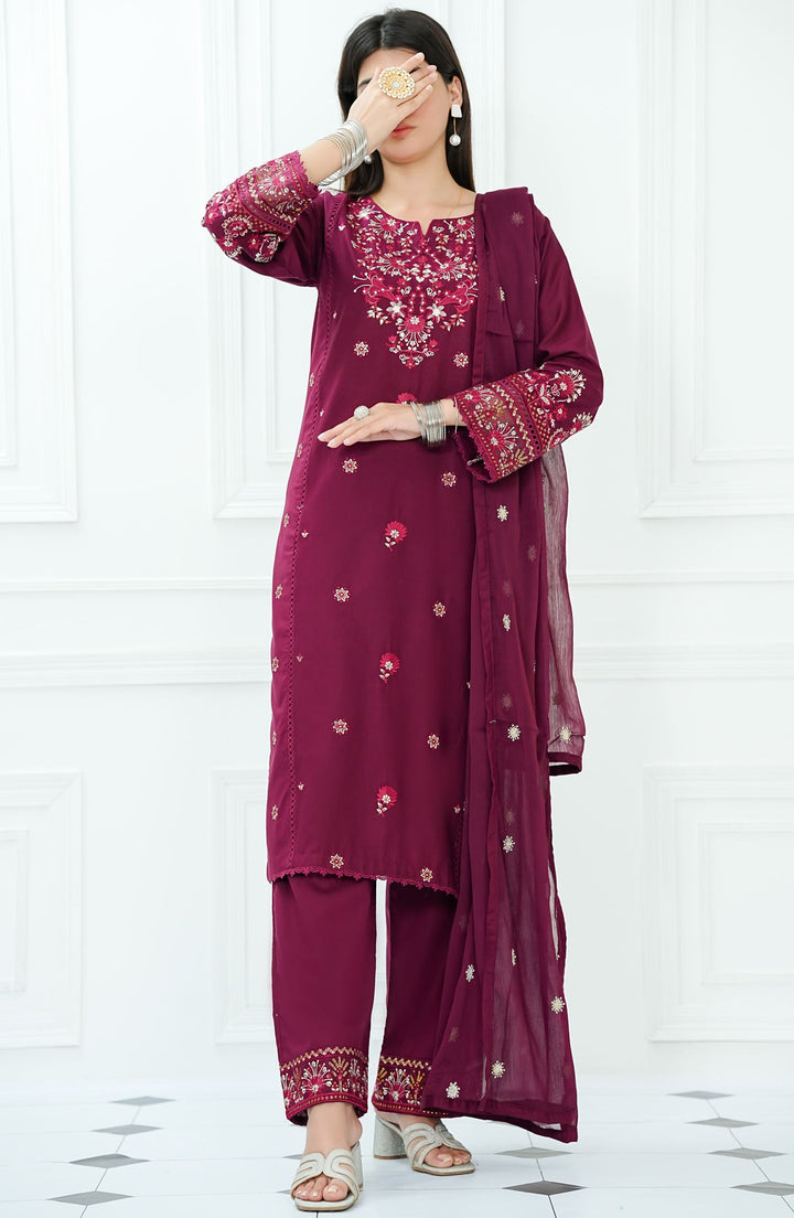 Amna Khadija - Ensemble Luxury Embroidered 3 Piece Lawn Maroon D-01