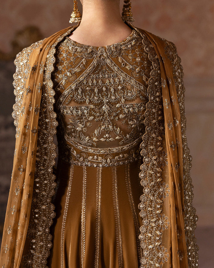 Crafted with meticulous attention to detail, Ermina is a true masterpiece. Cut from luxurious velvet in a vibrant mustard hue, the pishwas features a resplendent assortment of tilla, gota sequins and mirror work, accentuating its silhouette further. This set is paired with a silk churidaar and a lavishly adorned chiffon dupatta making it a total showstopping piece.