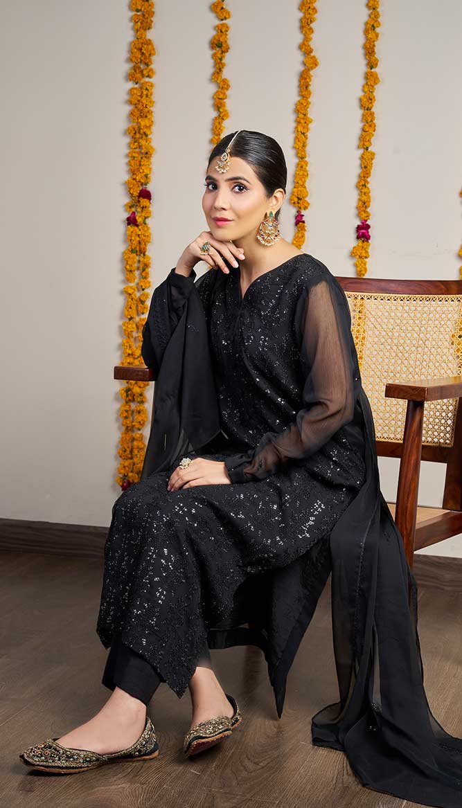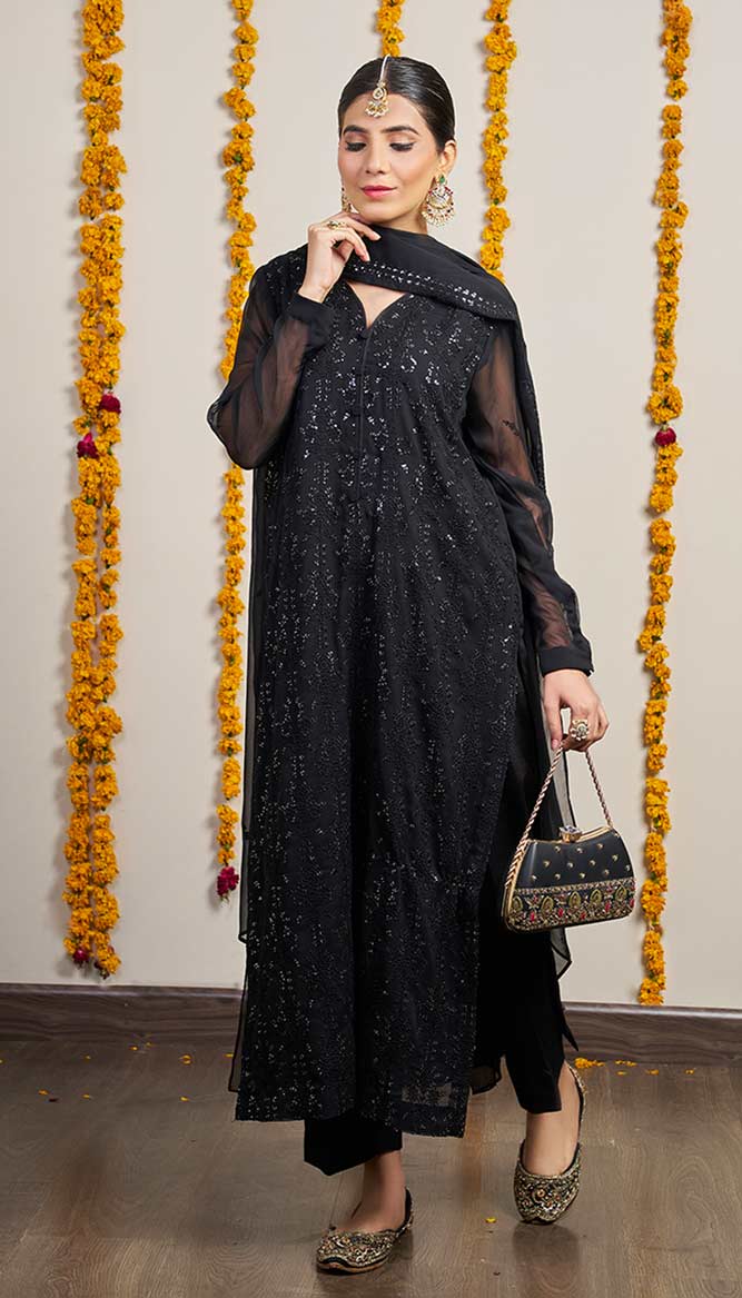 This black chiffon dress, adorned with dazzling sequins, combines classic elegance with modern sparkle. It's perfect for formal wedding celebrations and evening receptions since the shimmer provides the perfect amount of sophistication. The timeless black chiffon flows with ease, giving you a sophisticated and elegant appearance.