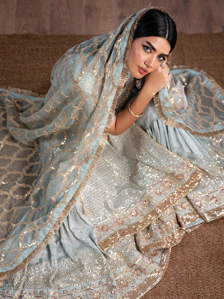 Heavily embellished sequence shirt, detailed with embroidered border at hem, paired with beautifully adorned Gharara and organza jaal dupatta.
