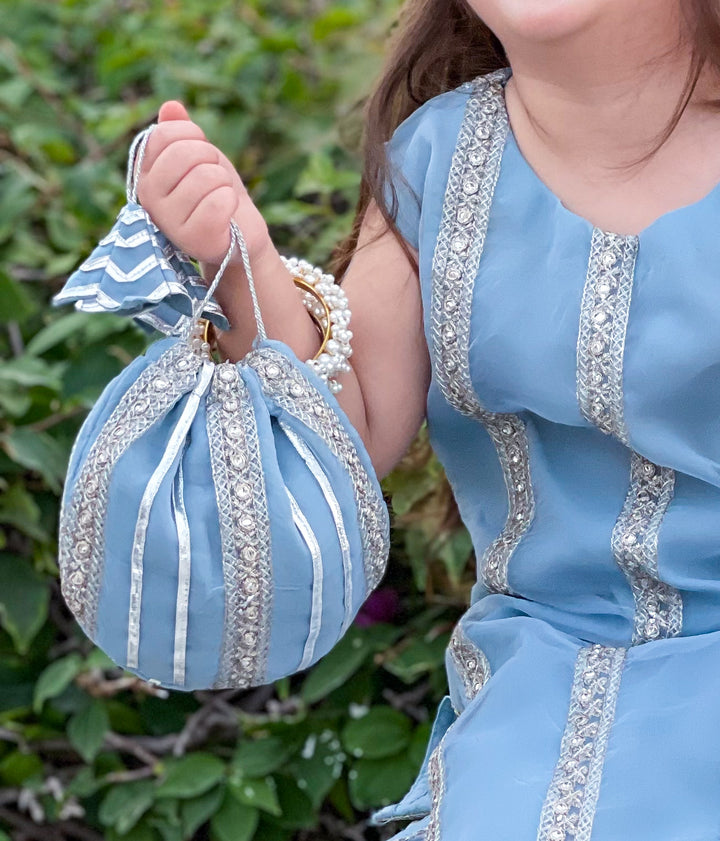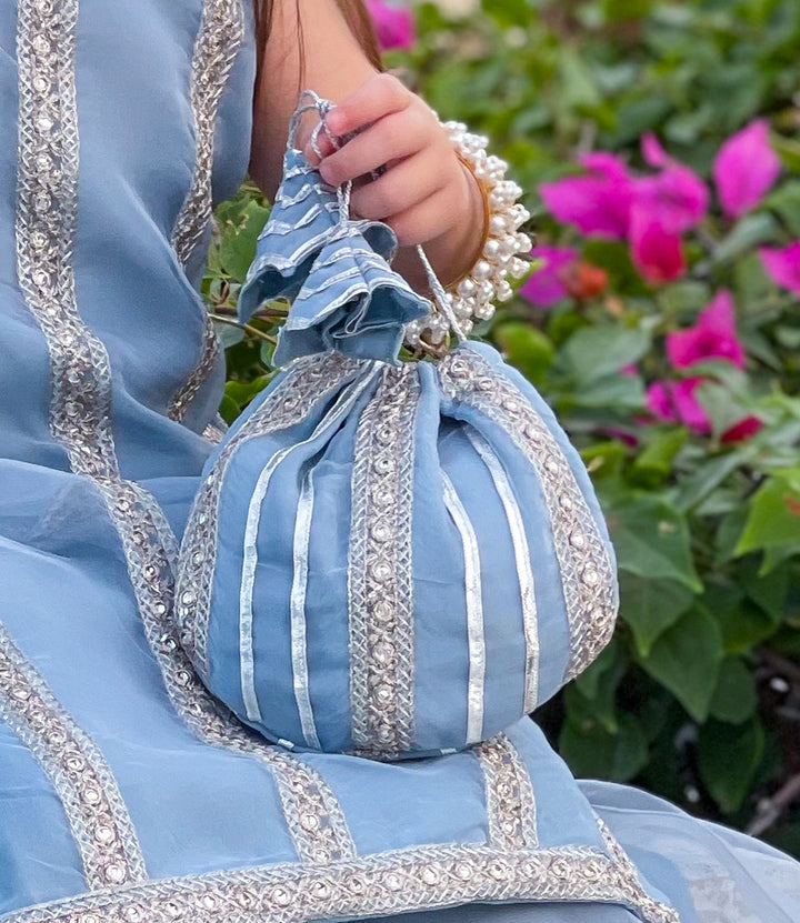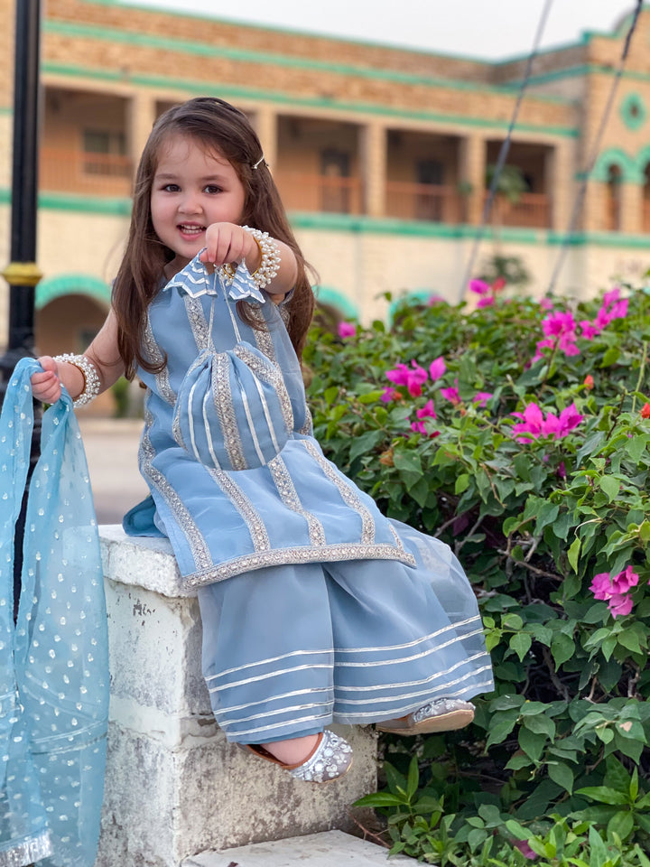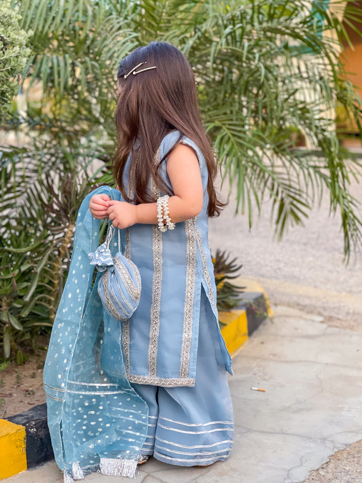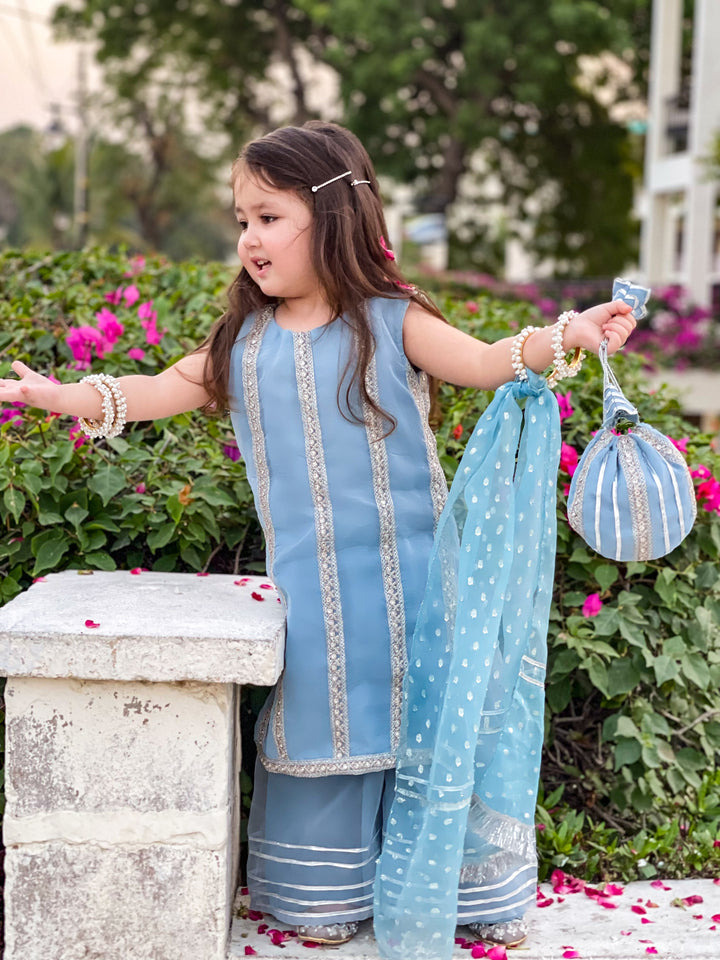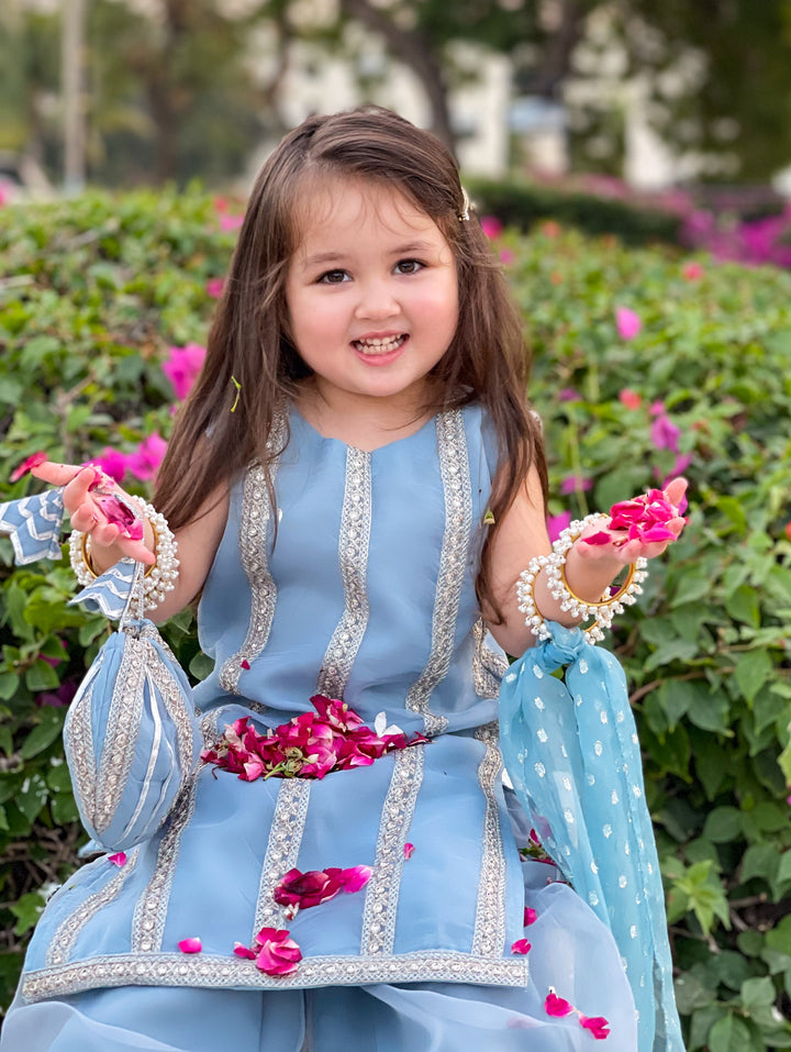Classy Powder blue color long shirt with plazo with all over lining and same color dupatta. The shirt is silver tilla embroidered and embelished with sequin and pani work with slightly deep back neck detailed with handmade tussles. Plazo and dupatta is detailed with silver goti and kiran. Note: Dupatta be in plain organza with gotta and kiran detailings.