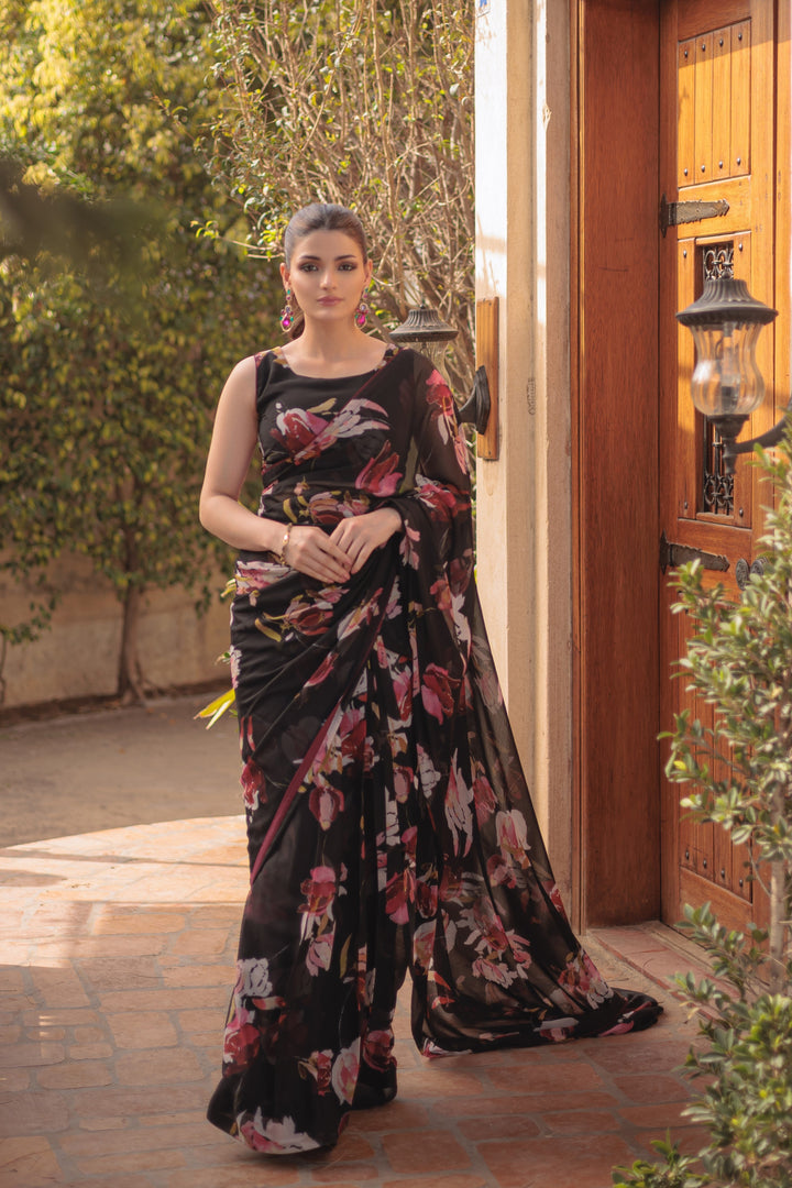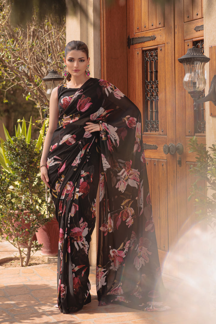 Crafted from soft, flowing fabric, the saree features intricate prints that add depth and character to its classic appeal. Designed for effortless draping, it offers a graceful silhouette that flatters every movement. Whether styled for an evening soiree or a festive gathering, this versatile saree embodies understated luxury and refined beauty.