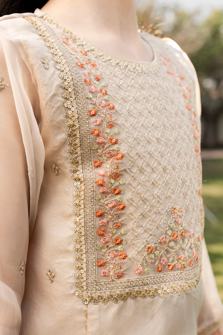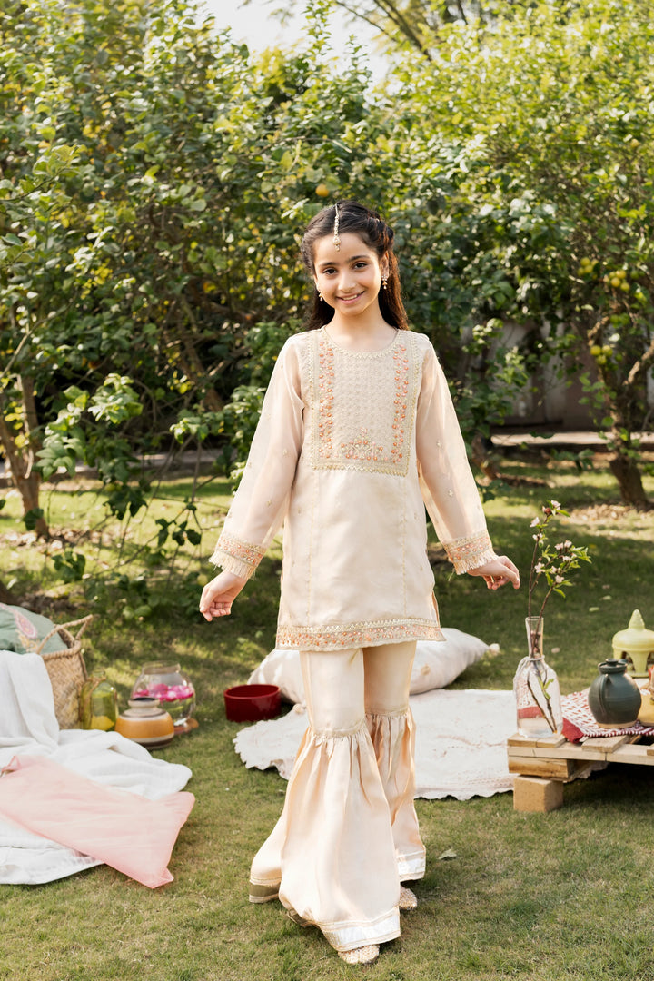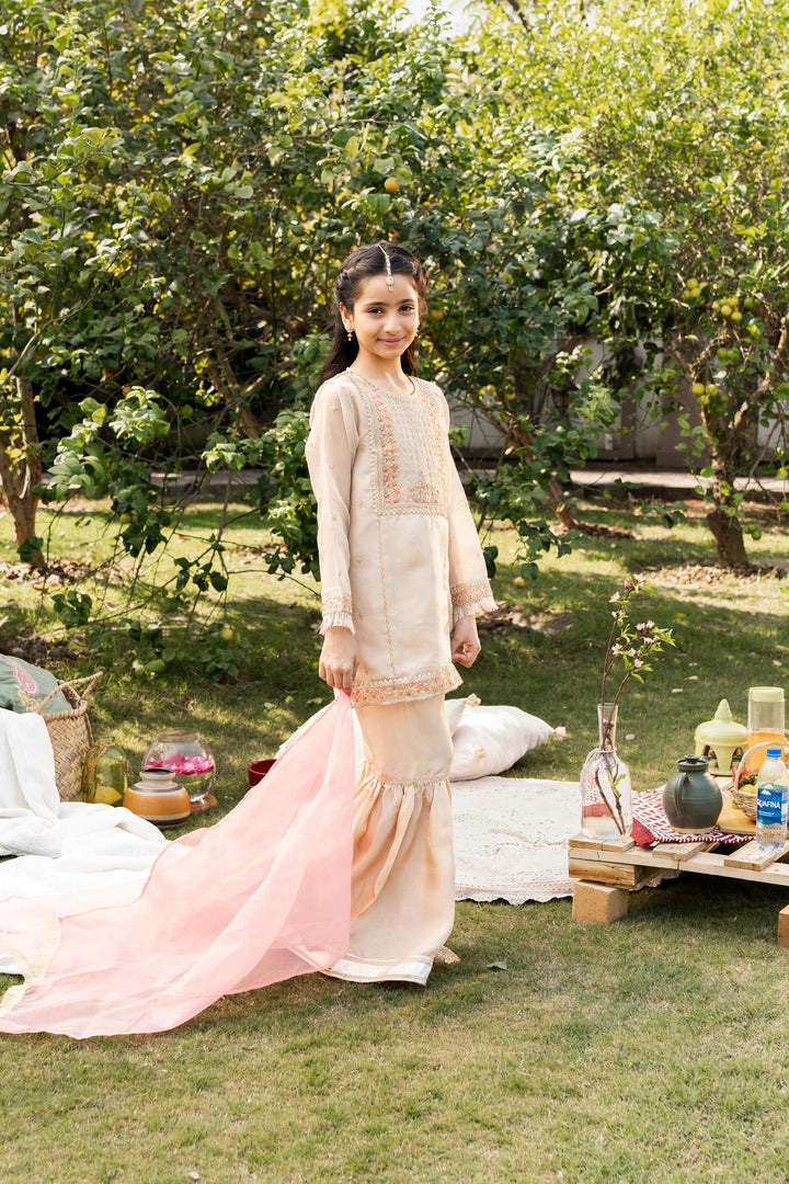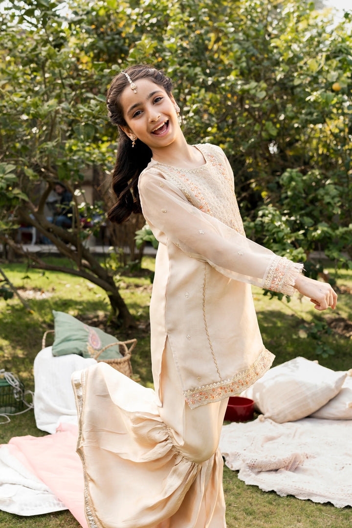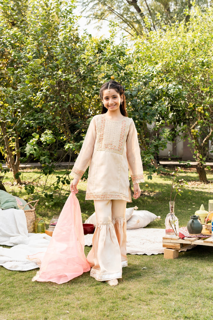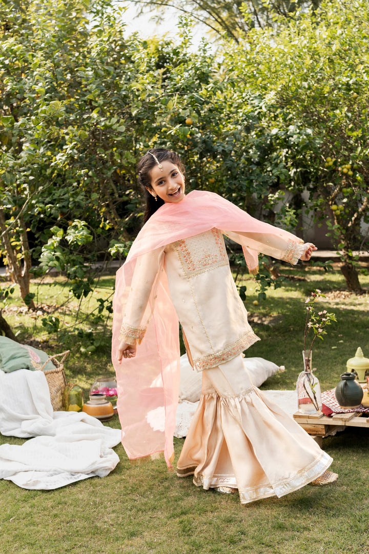 Al Qaswa - Girls Beige Embroidered Eid Outfit – 3-Piece Shirt, Sharara, and Dupatta Suit Set