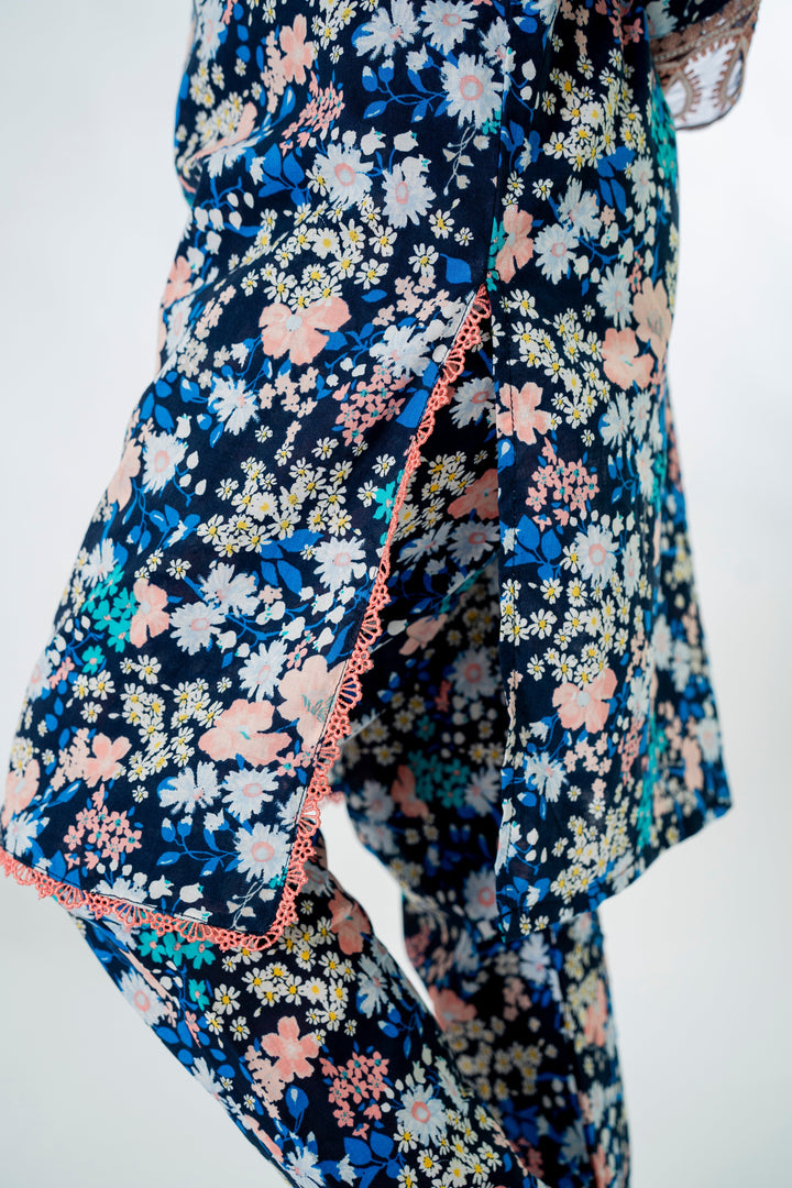 Al Qaswa - Girls Blue Printed Embroidered Eid Outfit – 2-Piece Shirt & Trouser Coord Suit Set
