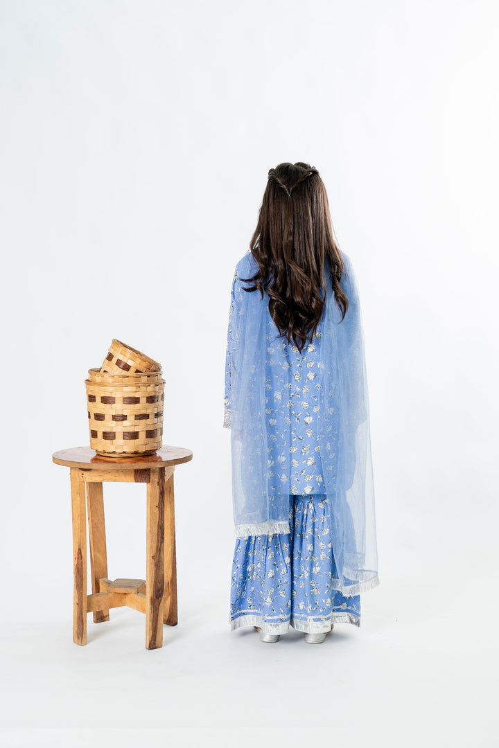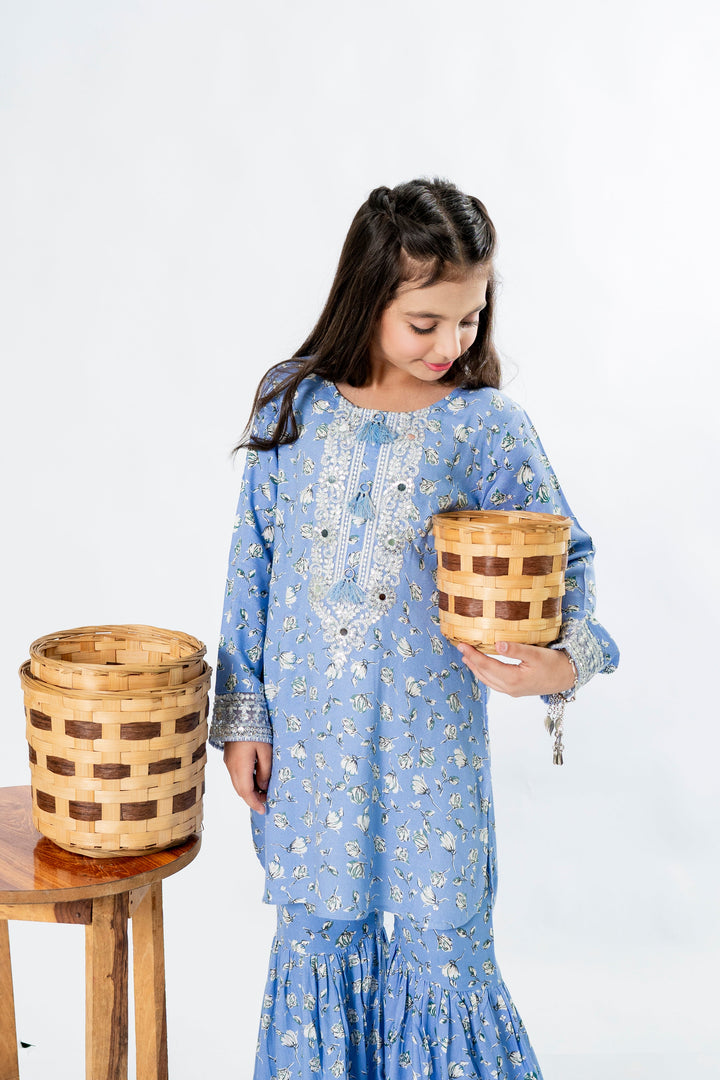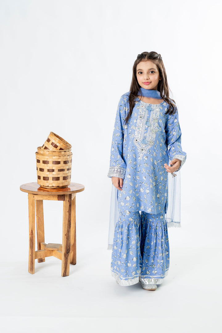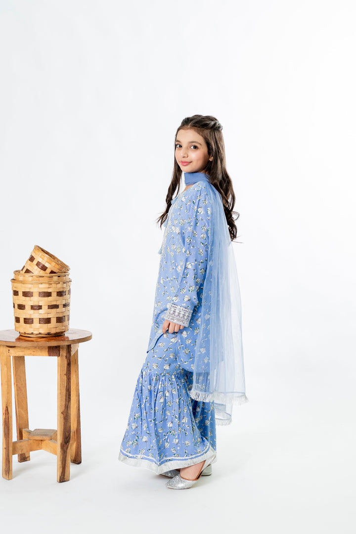 Al Qaswa - Girls Blue Printed Embroidered Eid Outfit – 3-Piece Shirt, Gharara , and Dupatta Suit Set