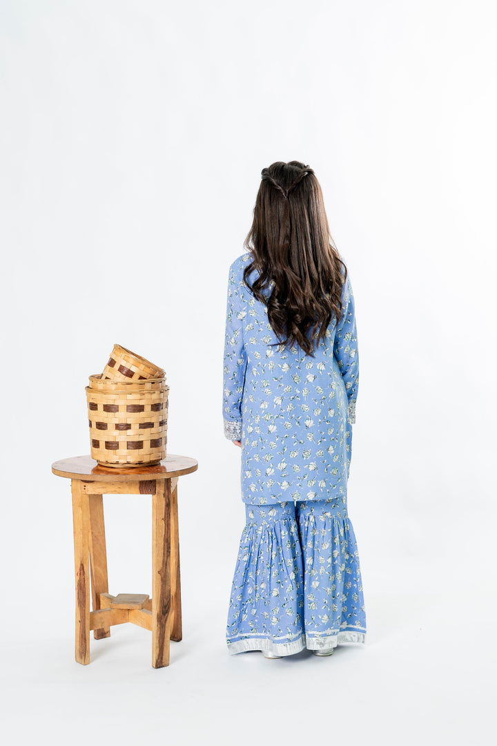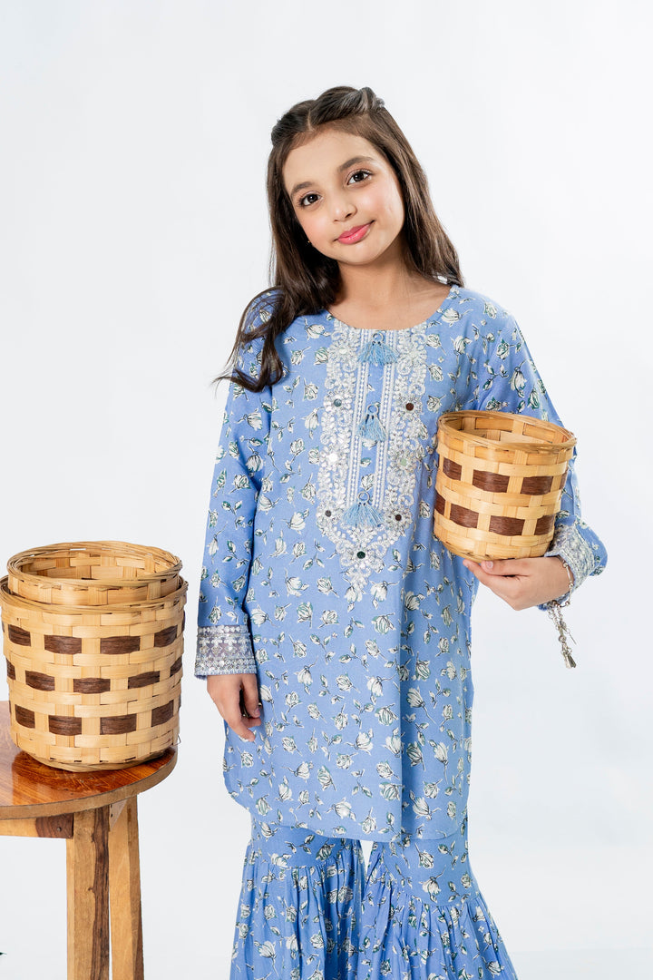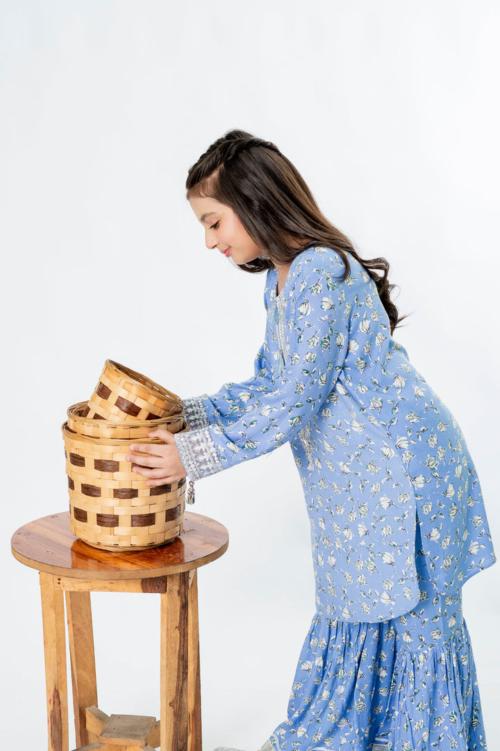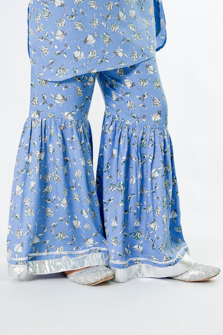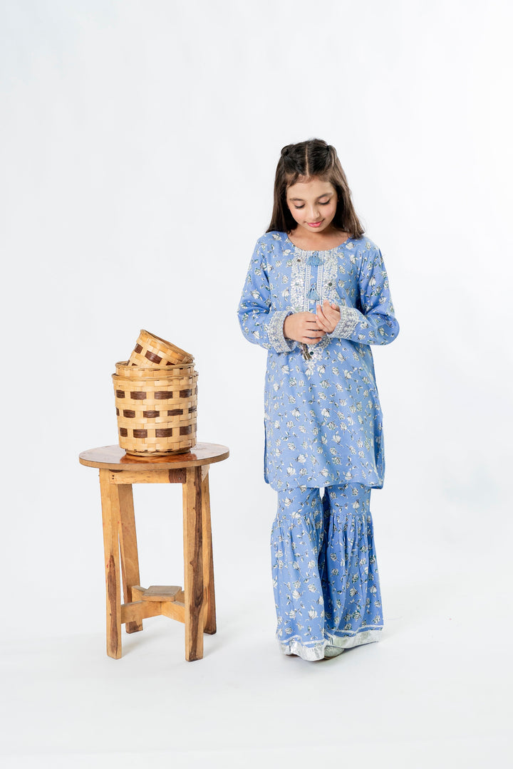 Al Qaswa - Girls Blue Printed Embroidered Eid Outfit – 3-Piece Shirt, Gharara , and Dupatta Suit Set