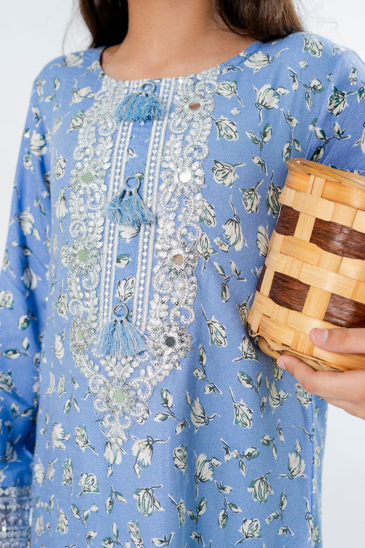 Celebrate Eid in style with our 3-Piece Blue Printed Embroidered Dress for Girls, a stunning addition to the Spring/Summer Eid Collection 2025. This traditional outfit blends festive charm with modern details, making it a perfect choice for your little girl.