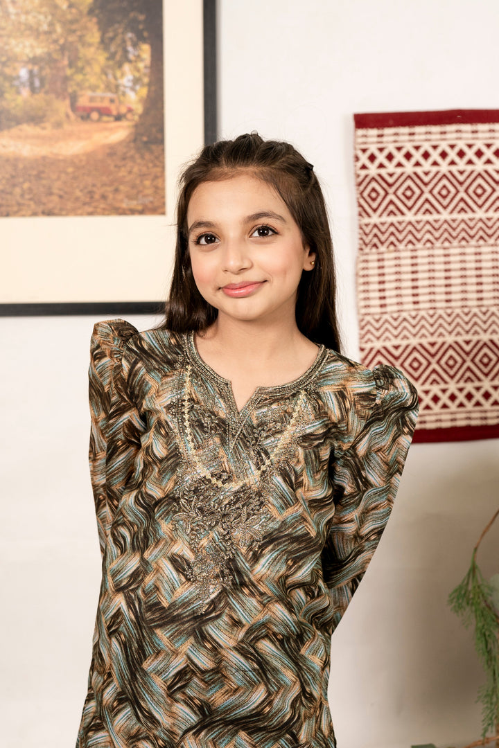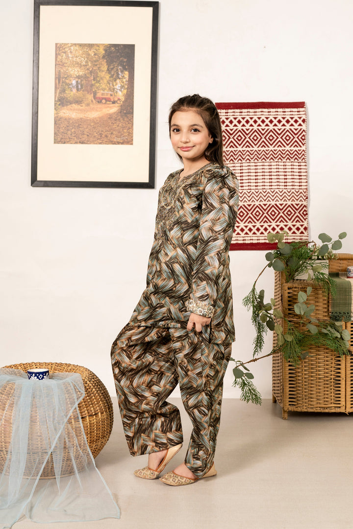 Al Qaswa - Girls Brown Printed Embroidered Outfit – 3-Piece Shirt, Shalwar, and Dupatta Suit Set