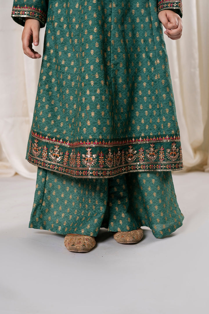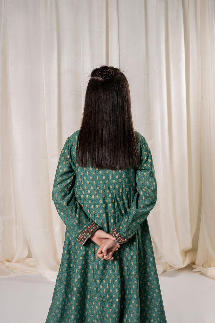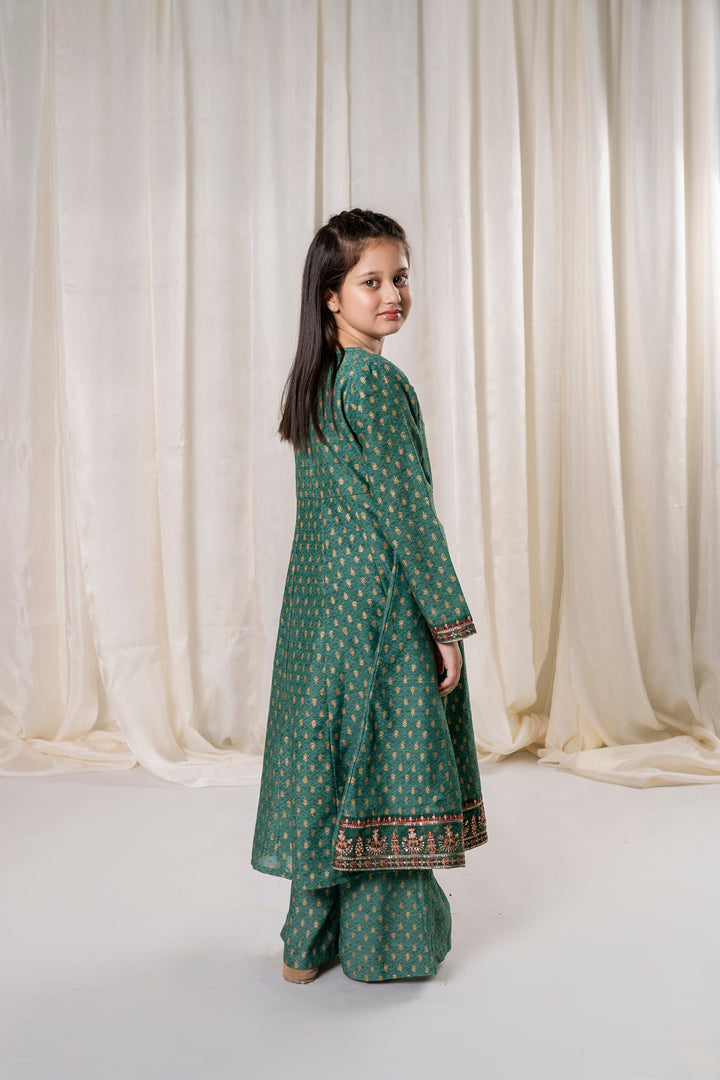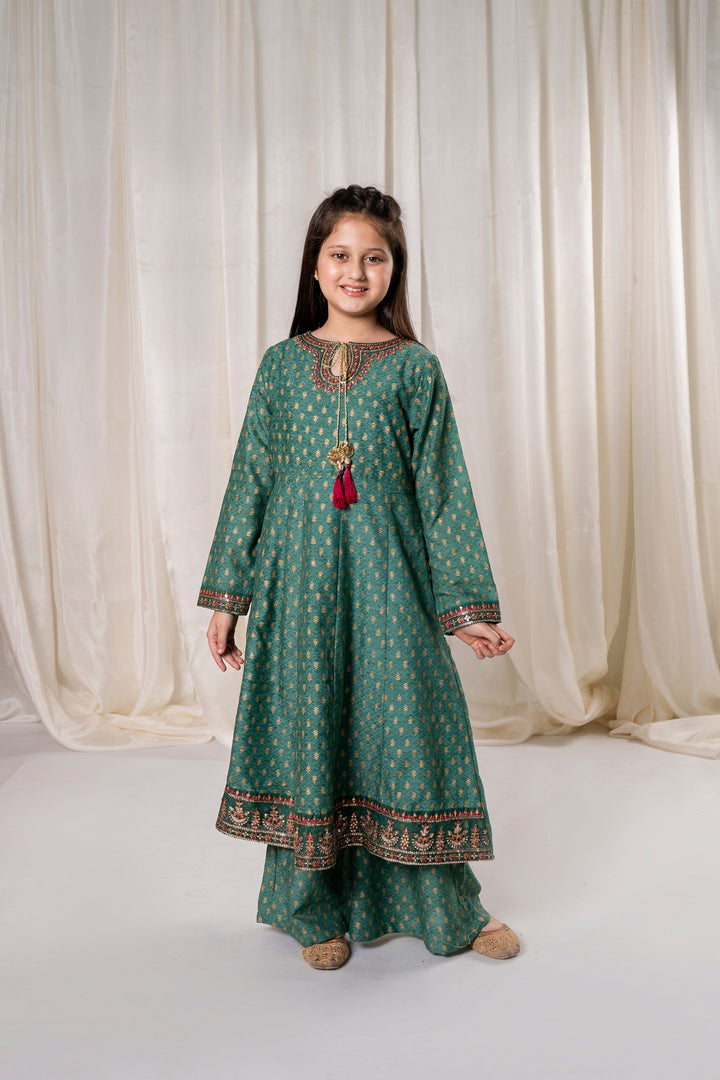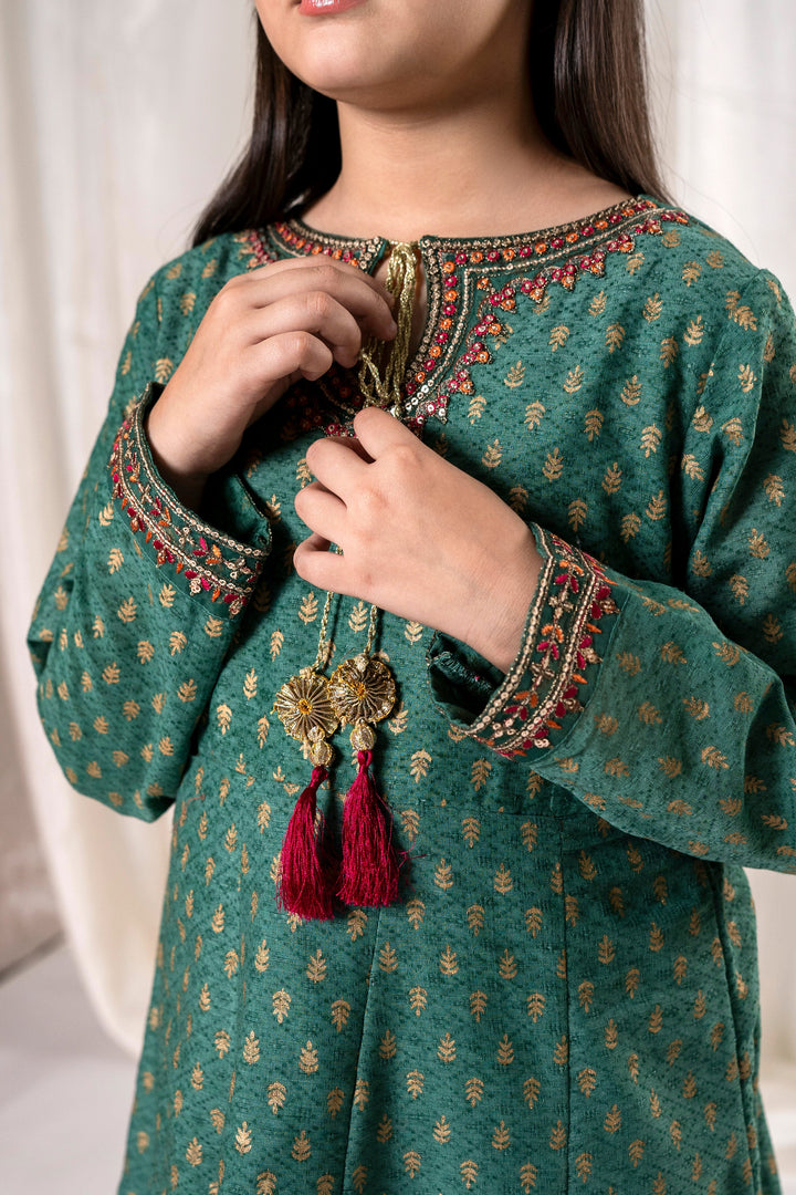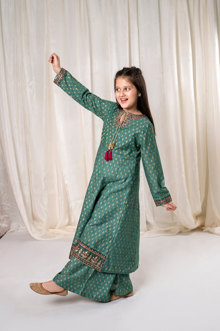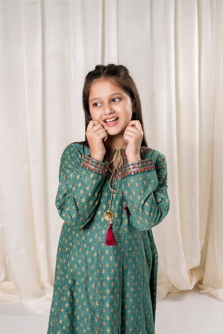 Al Qaswa - Girls Green Embroidered Eid V-1 Outfit – 3-Piece Shirt, Trouser , and Dupatta Suit Set