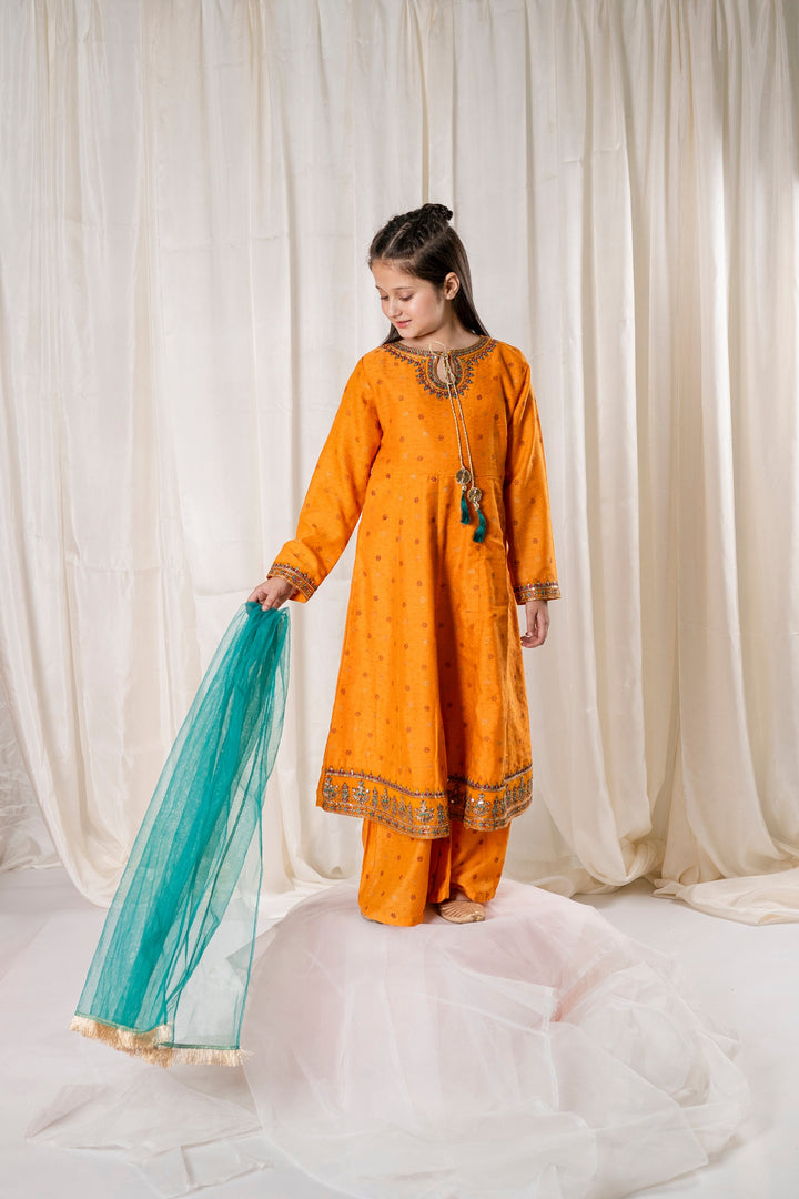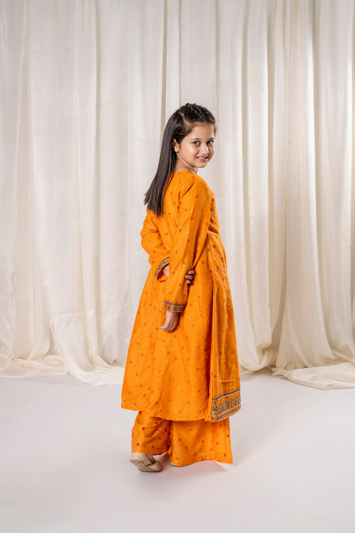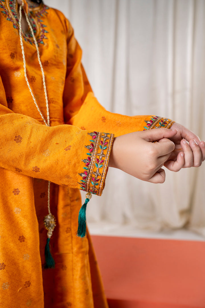Al Qaswa - Girls Mustard Yellow Embroidered Eid V-1 Outfit – 3-Piece Shirt, Trouser , and Dupatta Suit Set
