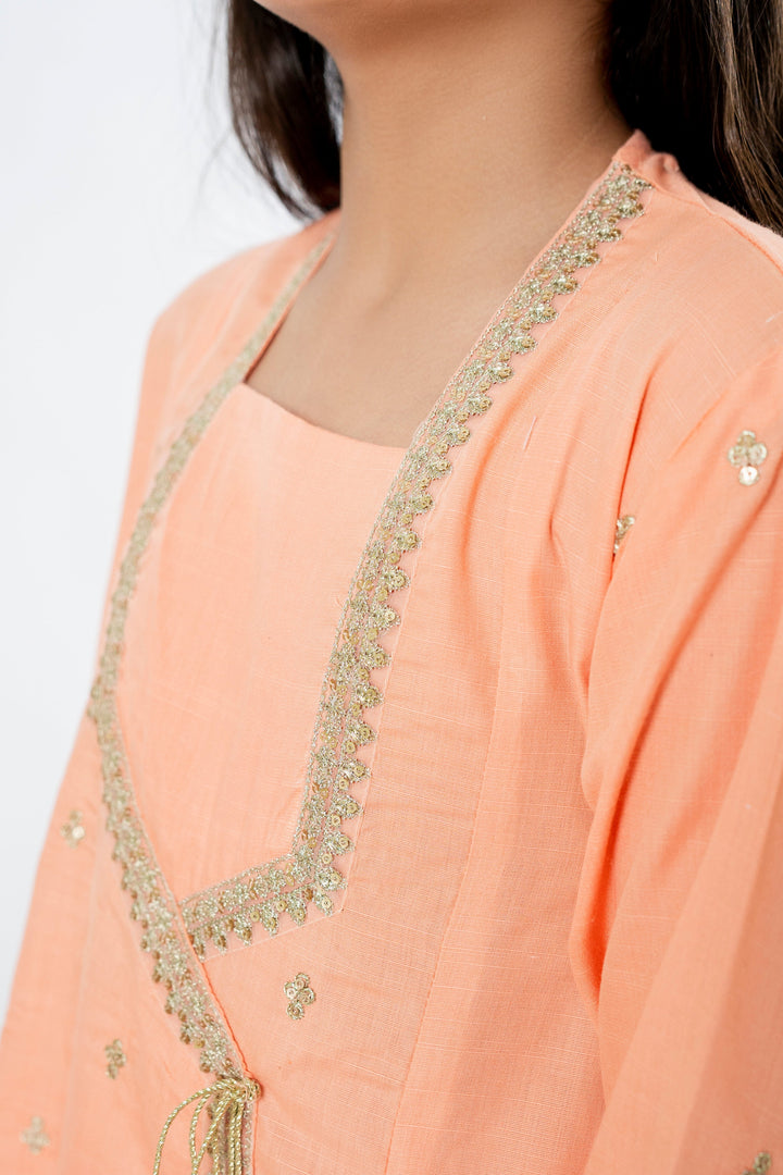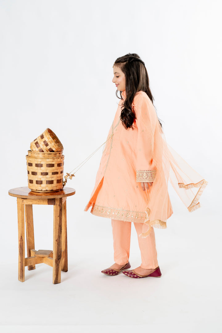 Al Qaswa - Girls Peach Eid Outfit – 3-Piece Kurti, Trouser, and Dupatta Suit Set