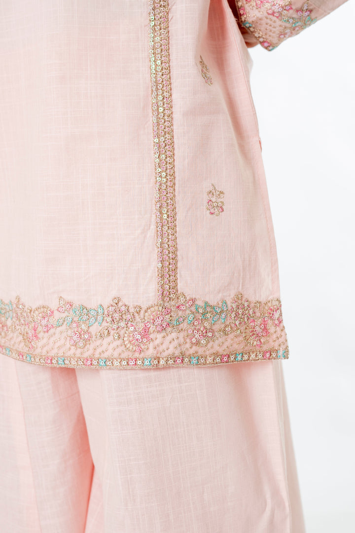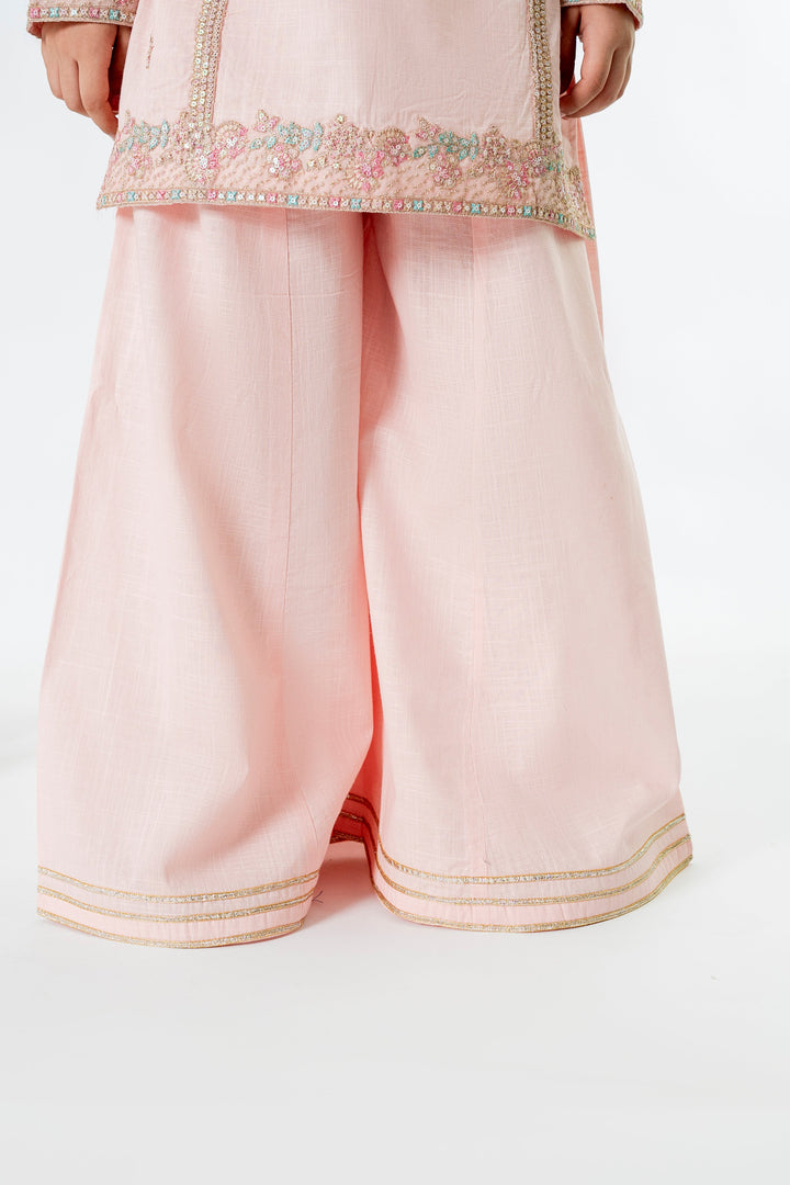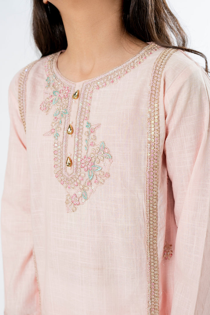 Al Qaswa - Girls Pink Embroidered Eid Outfit – 3-Piece Shirt, Pants, and Dupatta Suit Set