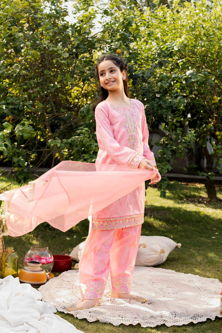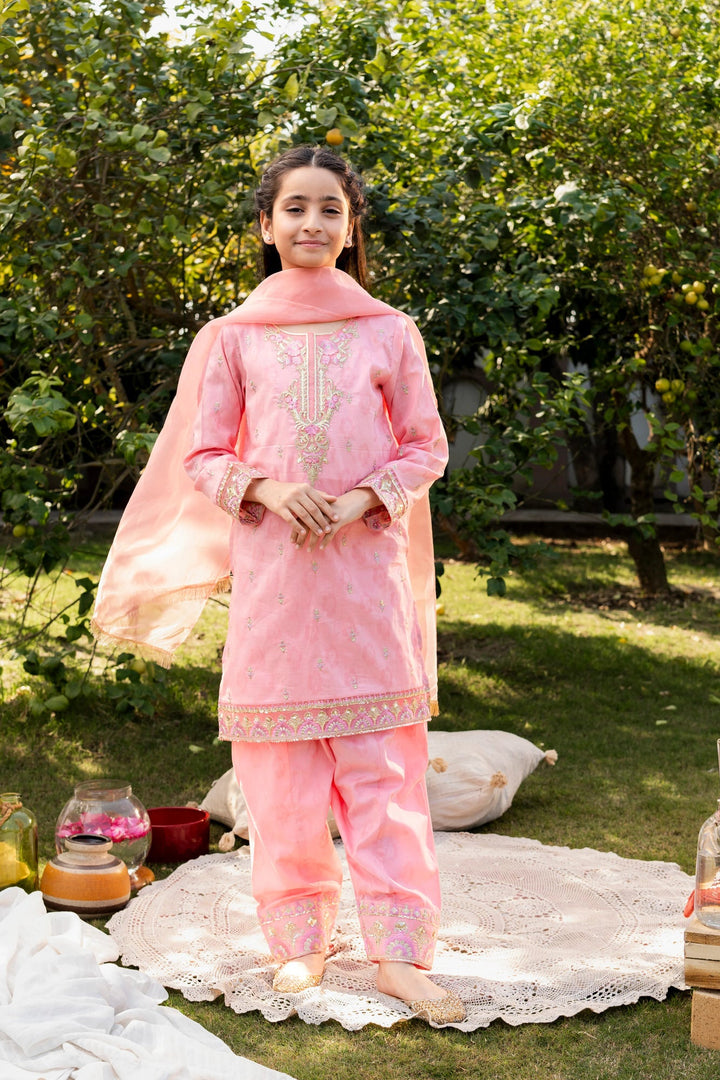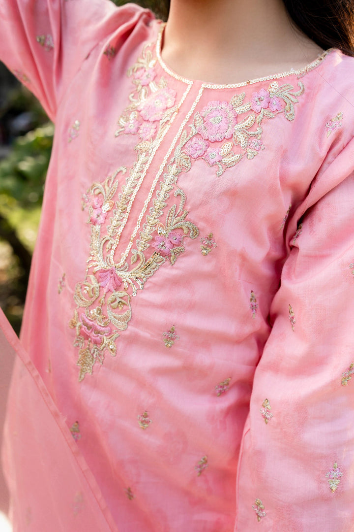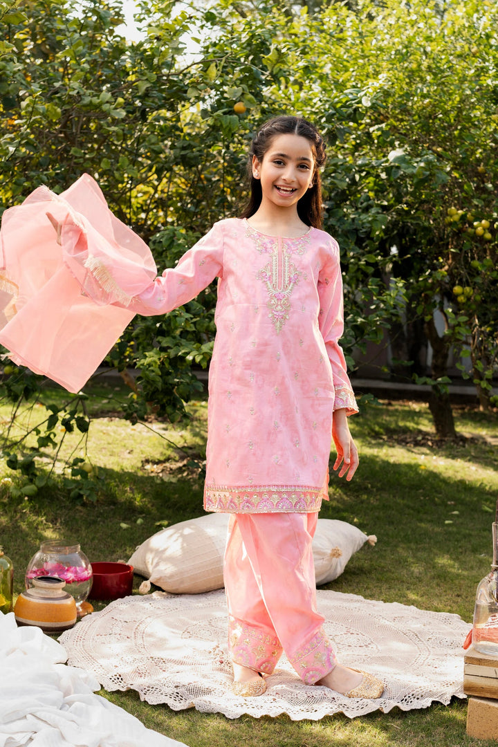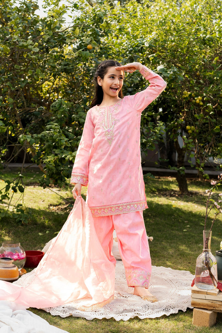 3-Piece Eid Dress for Girls – Stunning Pink Embroidered Lawn Outfit