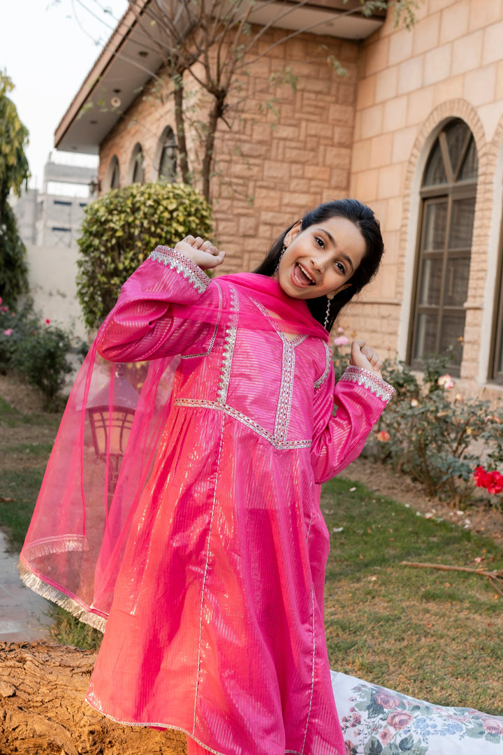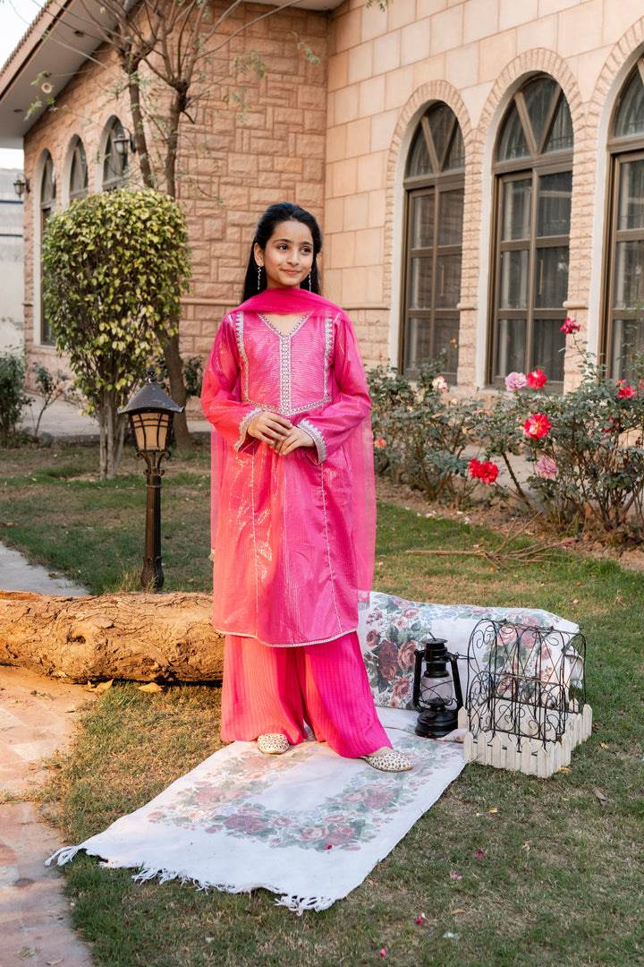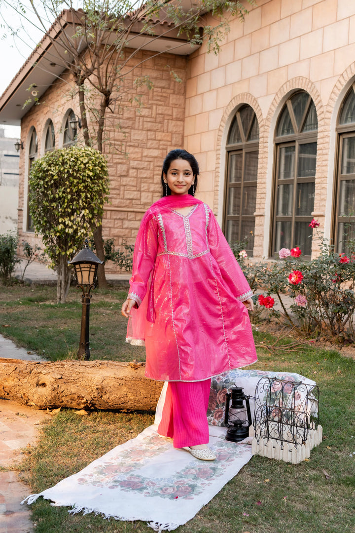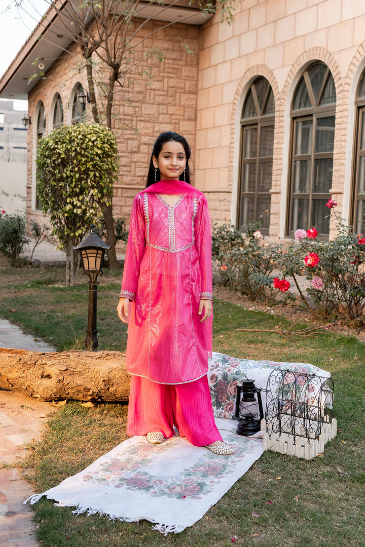 3-Piece Eid Dress for Girls – Elegant Hot Pink Embroidered Outfit
