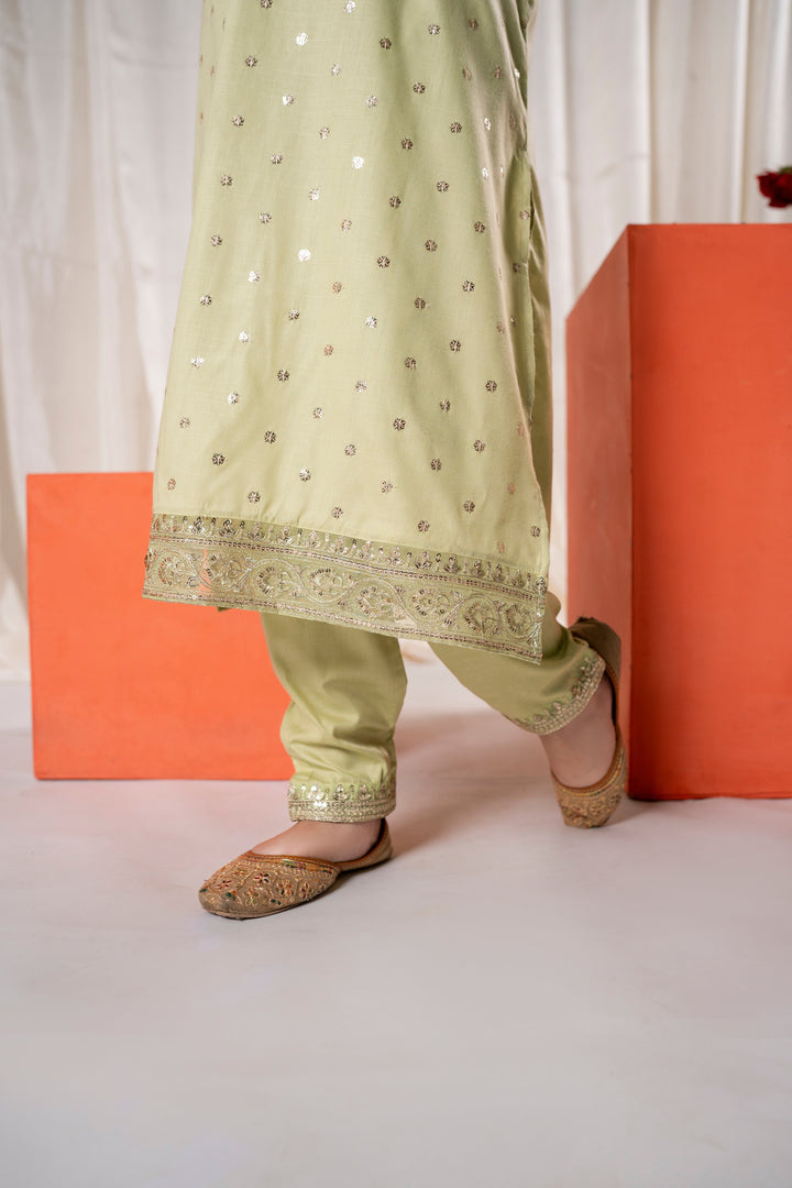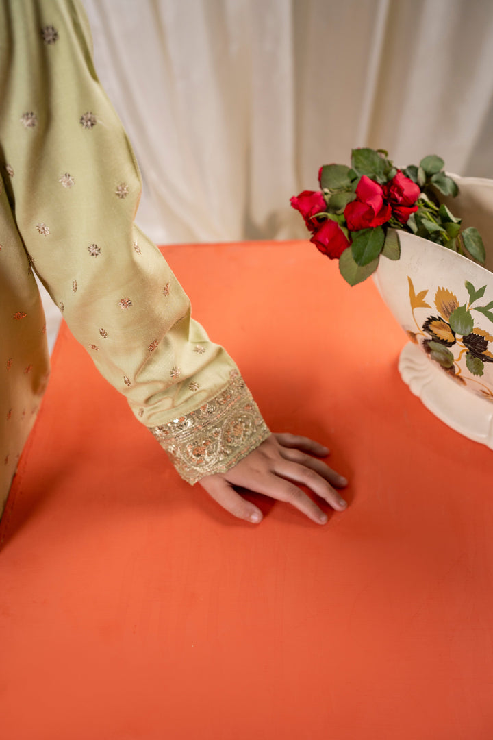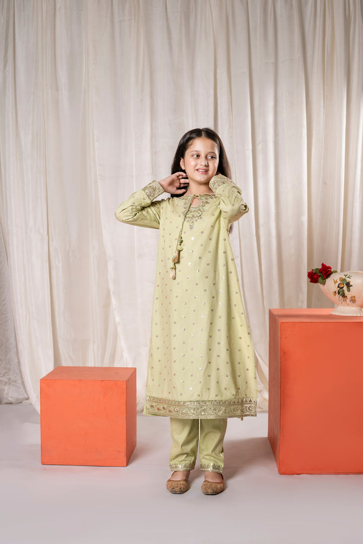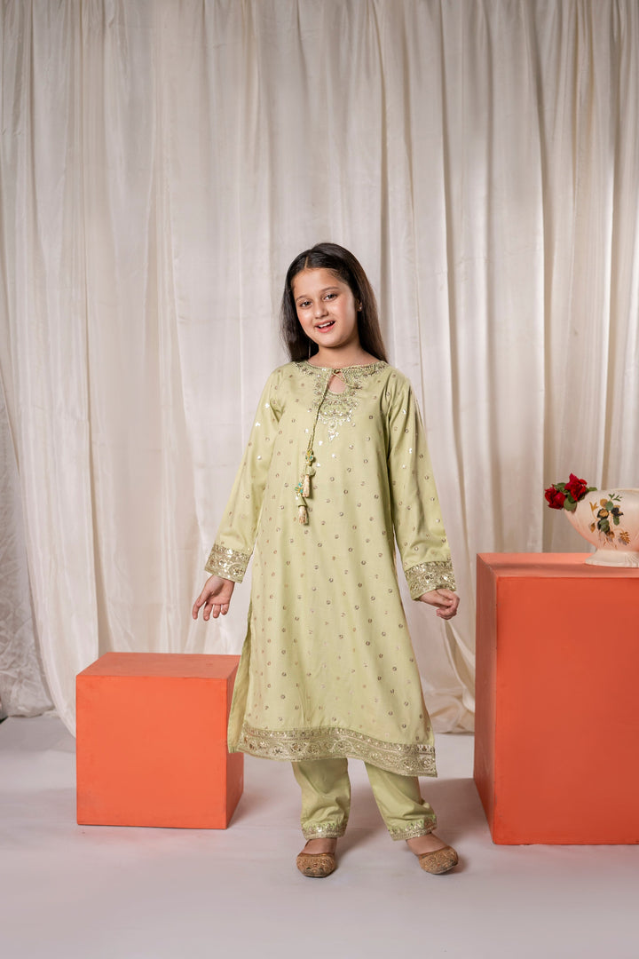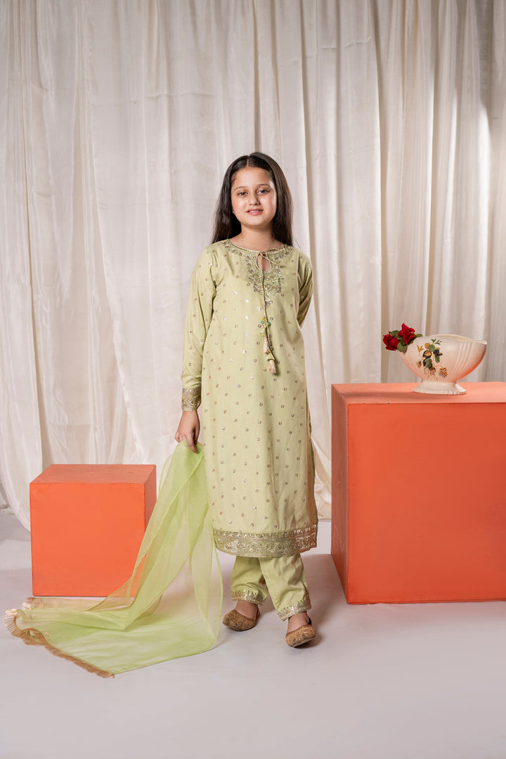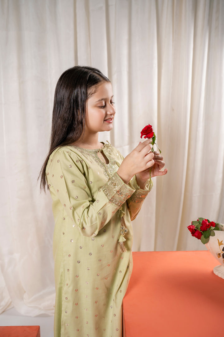 Al Qaswa - Girls Pistachio Green Embroidered Eid V-1 Outfit – 3-Piece Shirt, Trouser, and Dupatta Suit Set