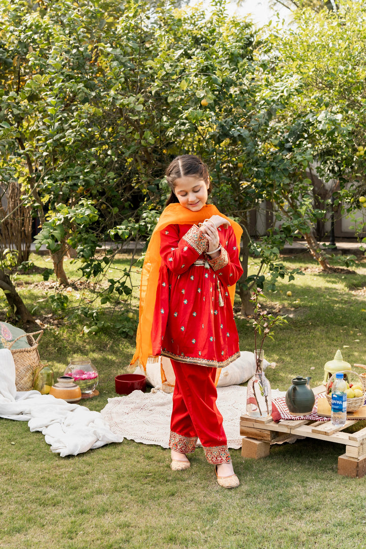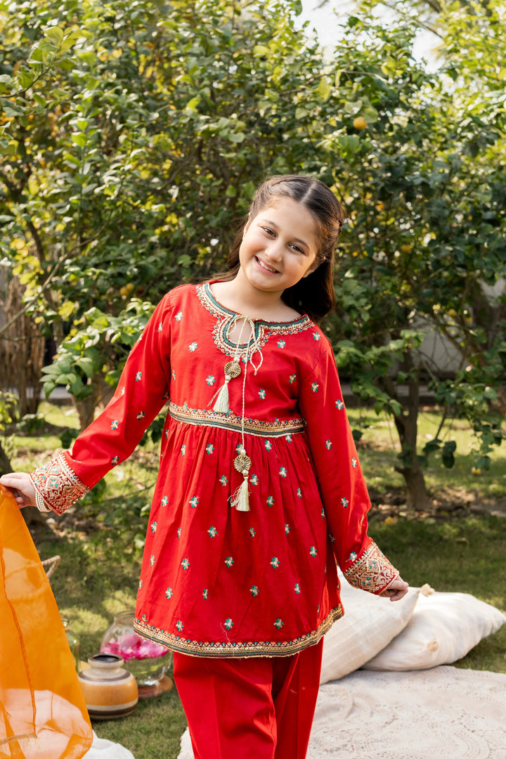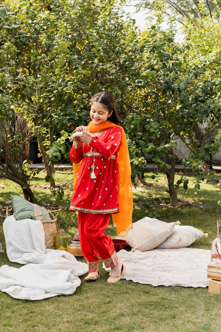 Al Qaswa - Girls Red Embroidered Eid Outfit – 3-Piece Kurti, Shalwar, and Dupatta Suit Set
